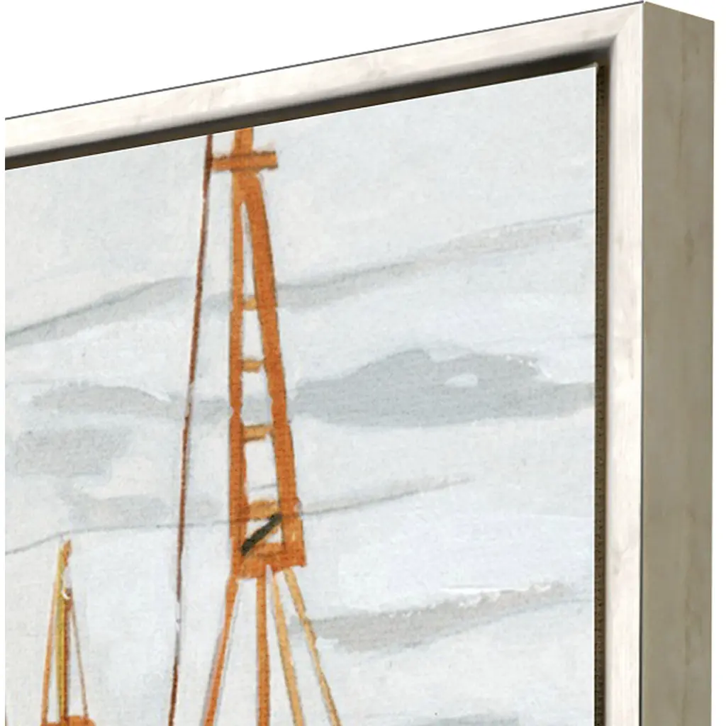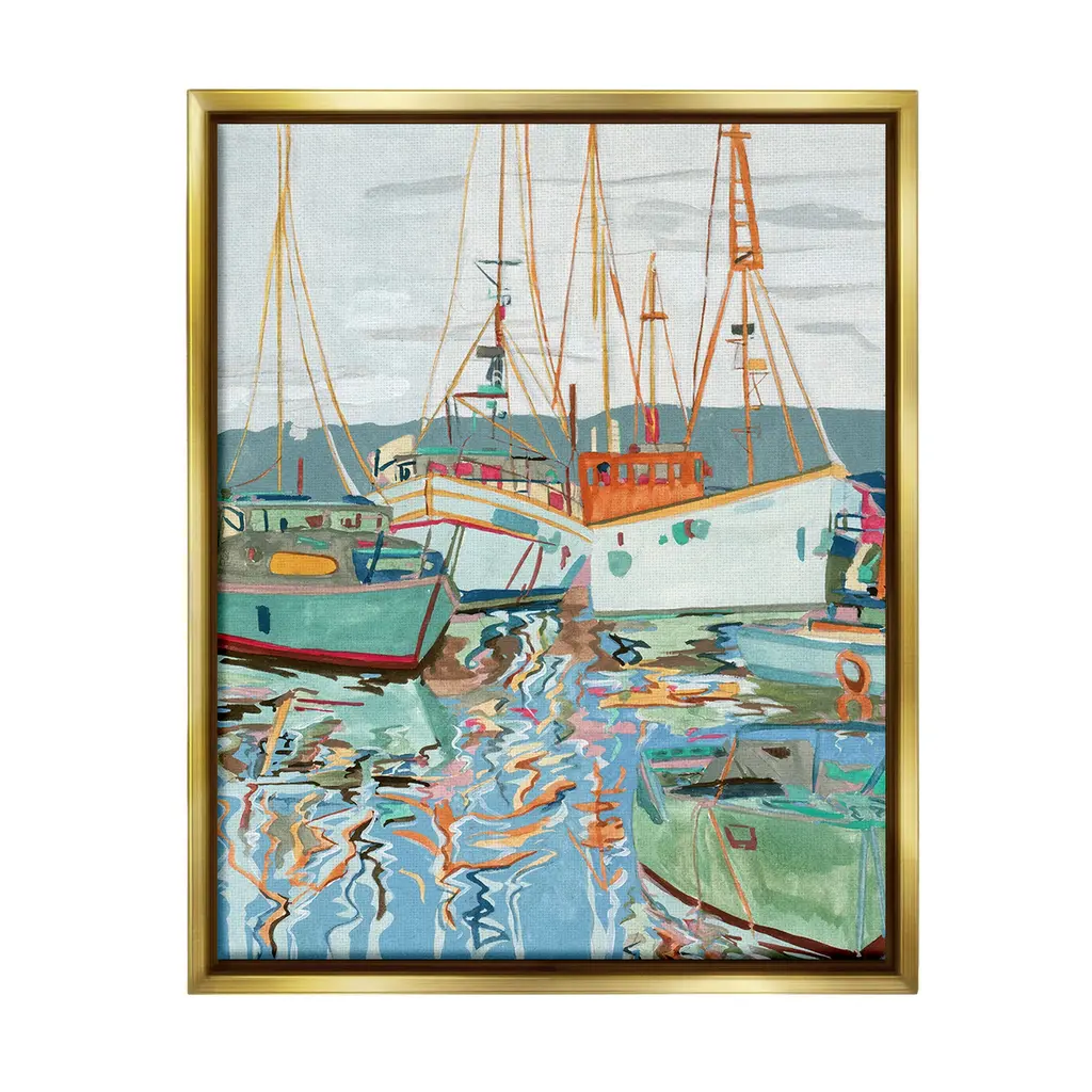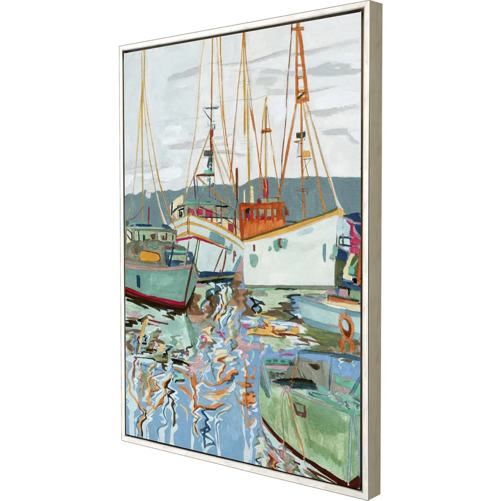 Brightly colored boats anchor near the water's edge. Canvas is wrapped around wood stretcher bars and mounted in a whitewash floater frame.