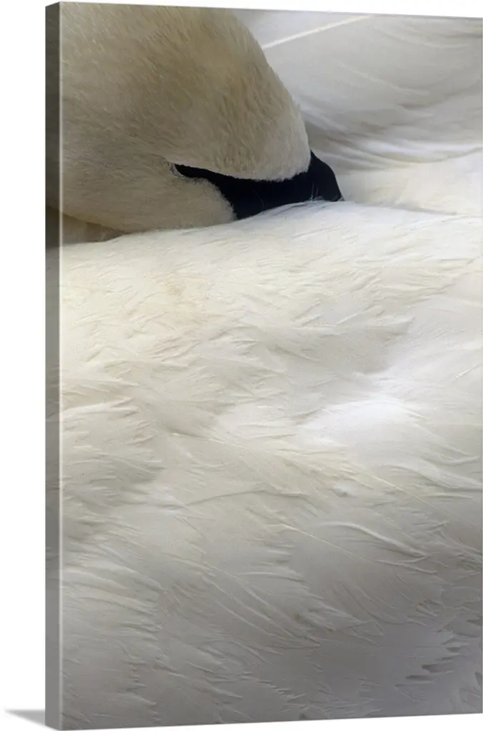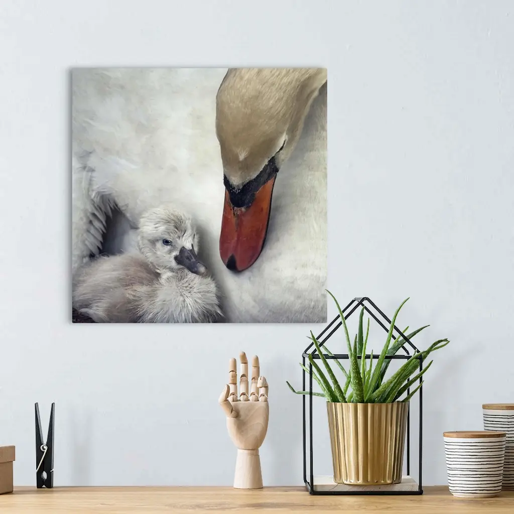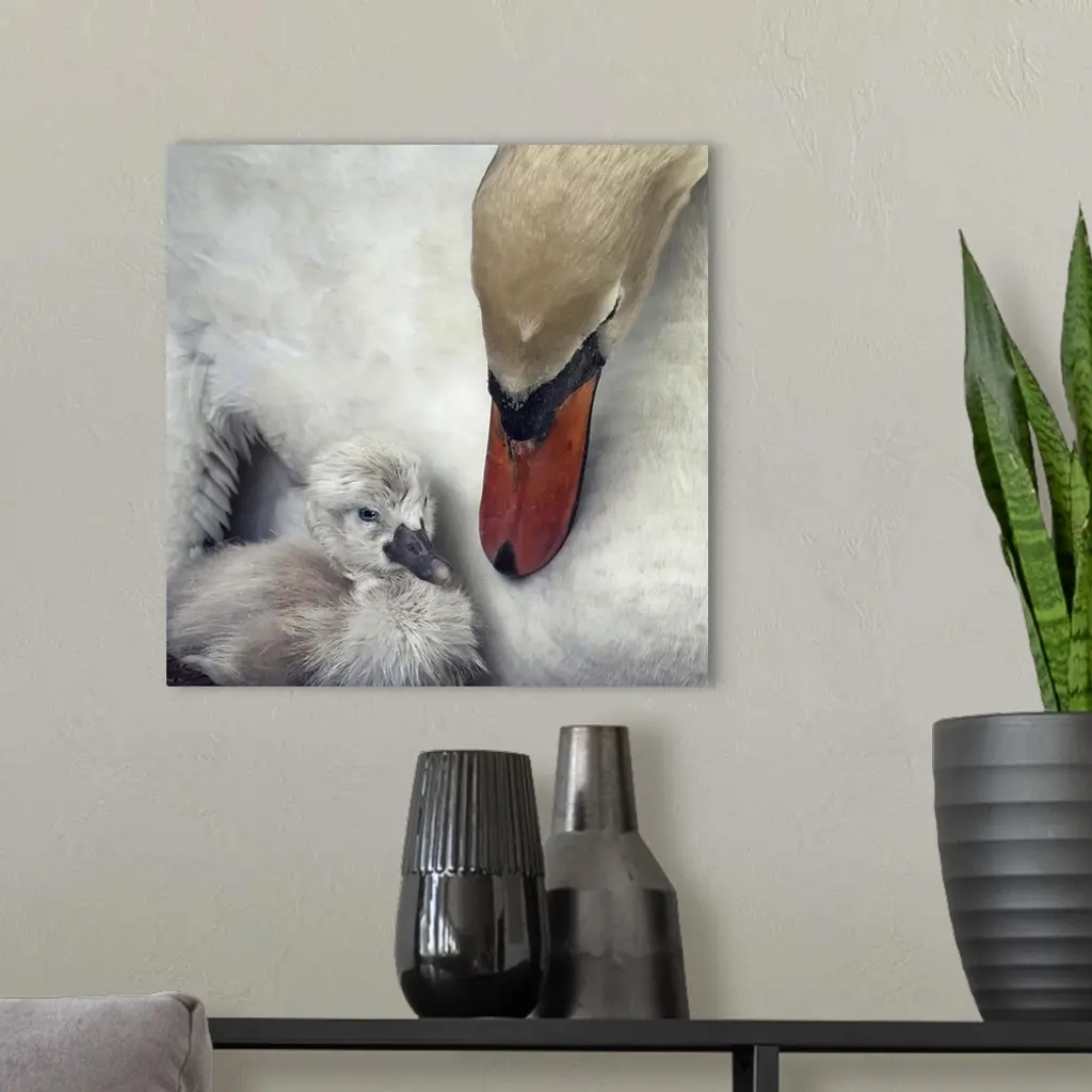 A young cygnet snuggles closely to its mother who is keeping watch over him.