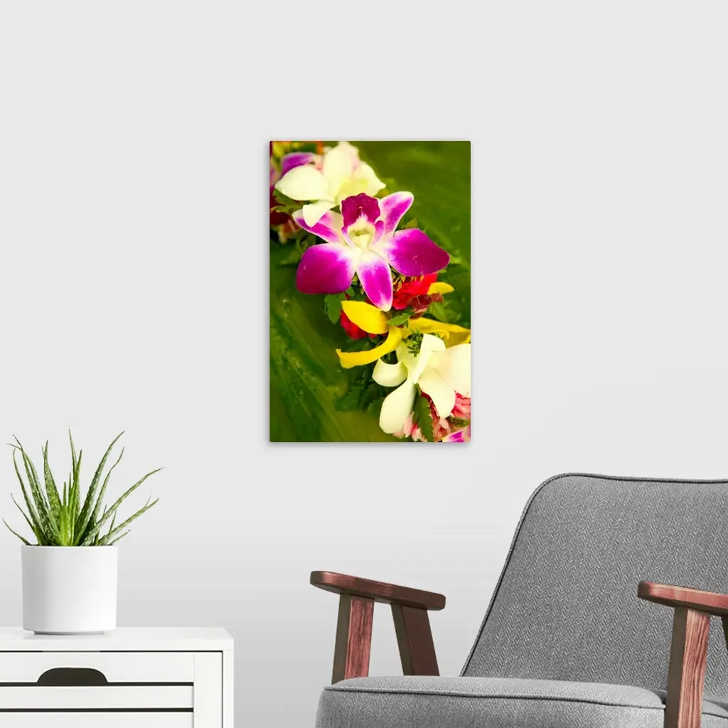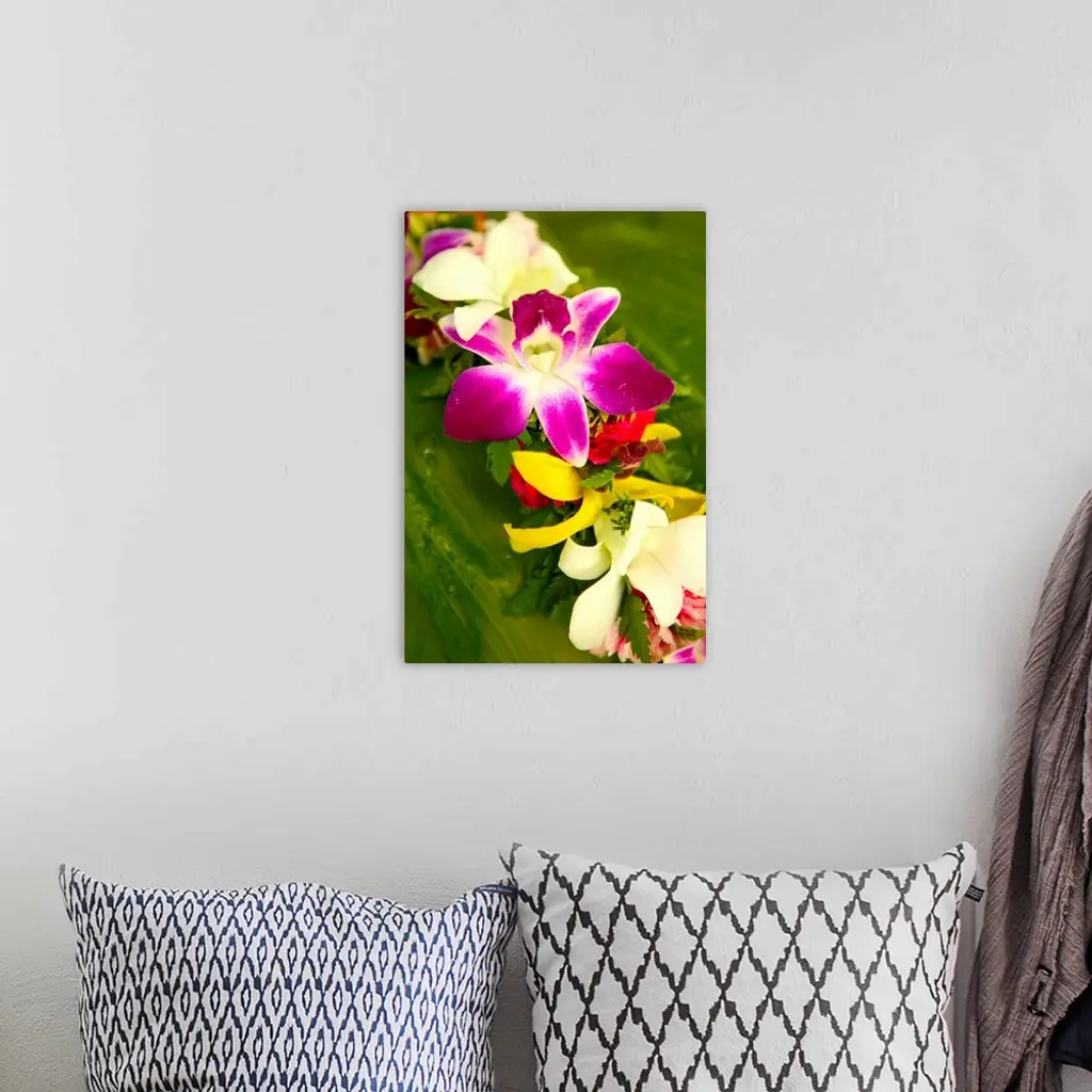 Close-Up Detail Of A Vibrant Colored Lei Made With Tropical Flowers wall art for home and office decor. Discover canvas art prints, photos, mural, big canvas art and framed wall art in GreatBigCanvas.com's varied collections.