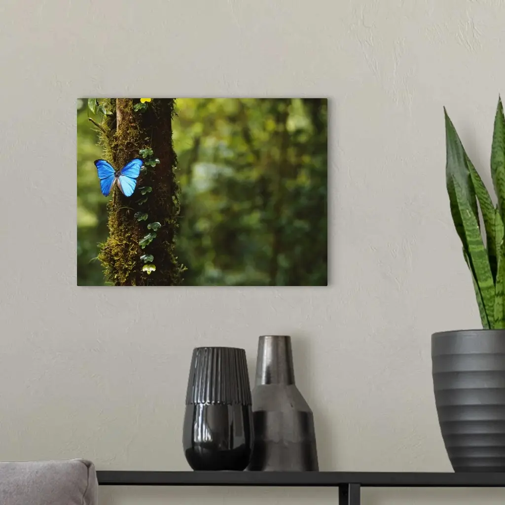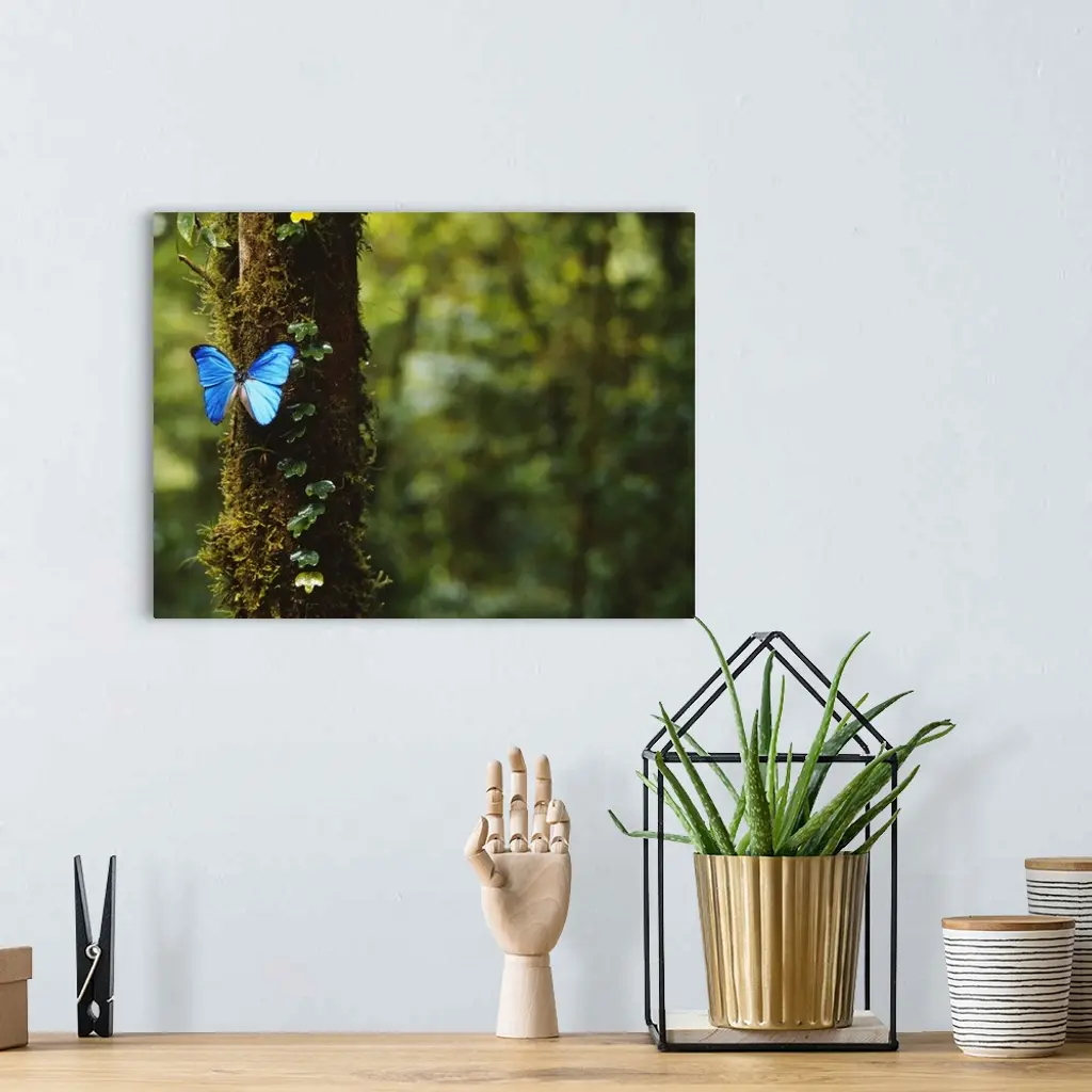 A big photograph of a blue butterfly sitting on a tree trunk with the forest in the background shown out of focus.