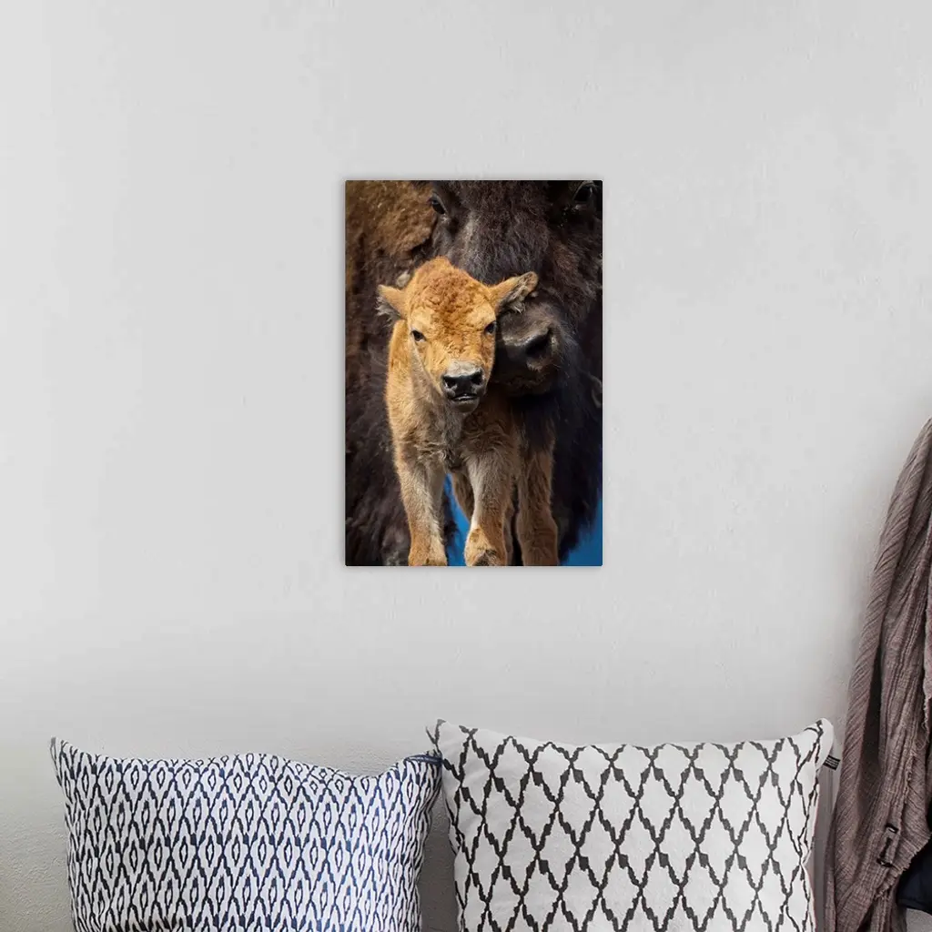 A few-day-old Wood bison calf looks at camera while its protective mother snuggles against it. Captive. AWCC. Southcentral Alaska. Summer.