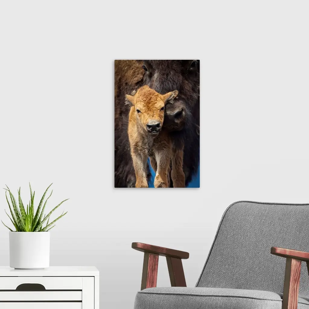 Close Up Of A Newborn Wood Bison Calf And Mother, Alaska Wildlife Conservatiion Center
