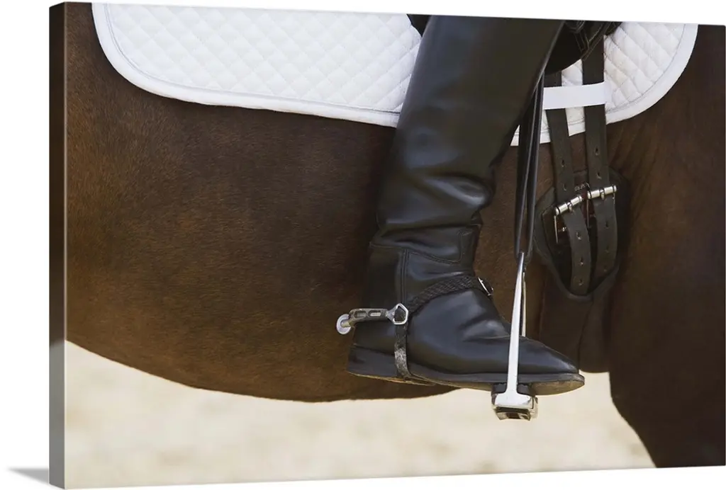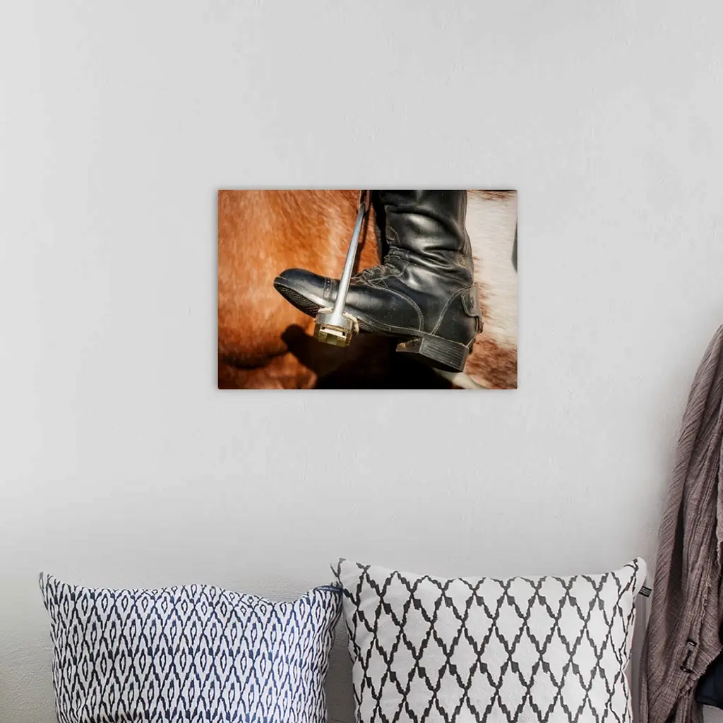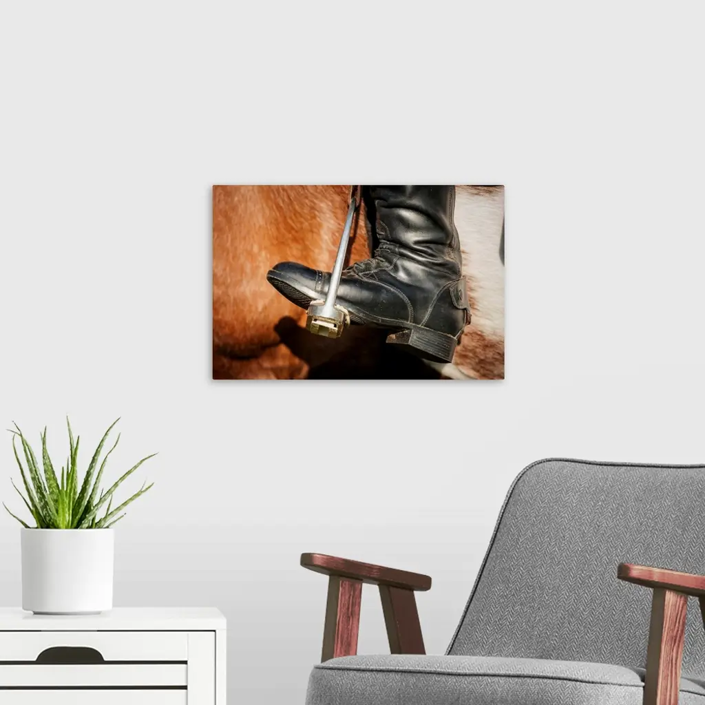 Close up of a riding boot in stirrups in Baltimore County, Maryland wall art for home and office decor. Discover canvas art prints, photos, mural, big canvas art and framed wall art in GreatBigCanvas.com's varied collections.