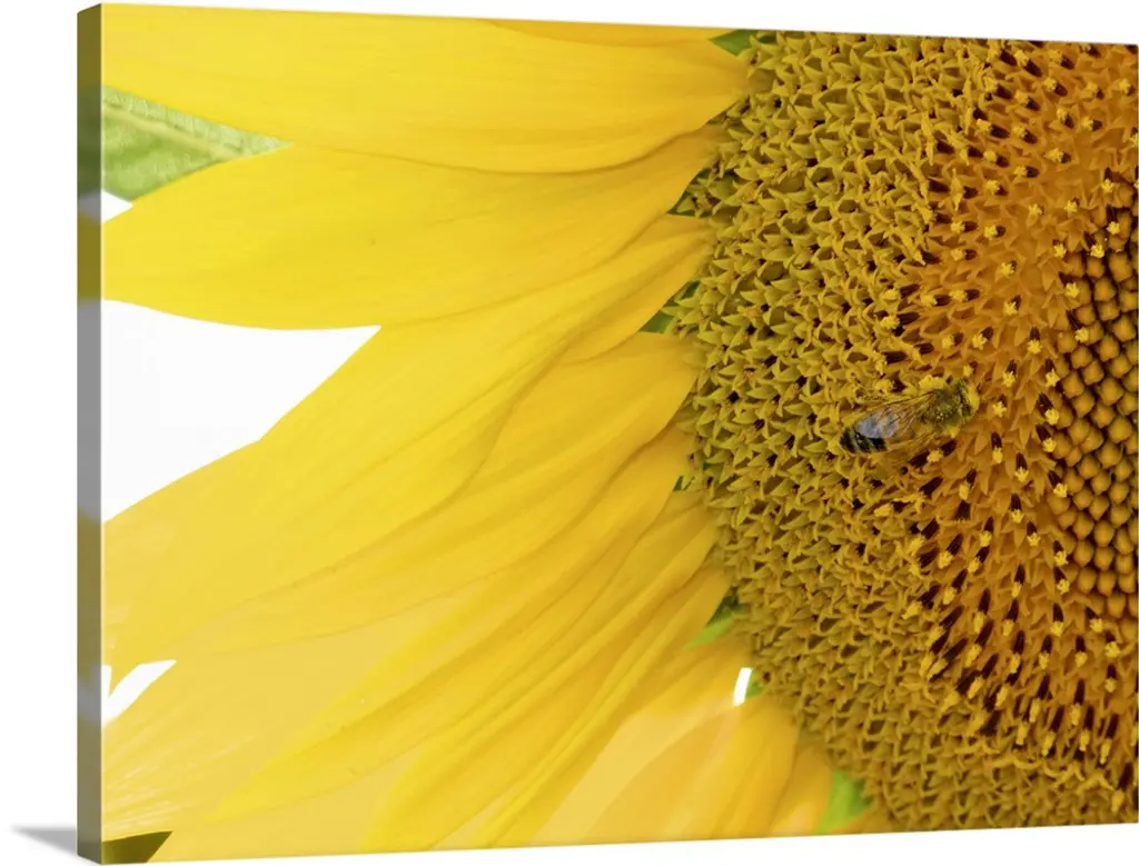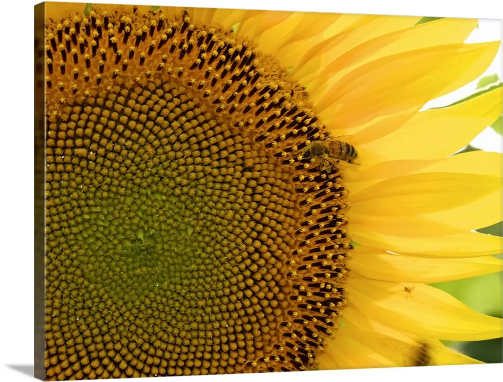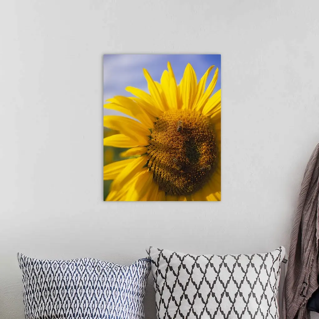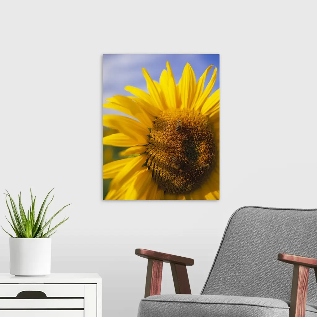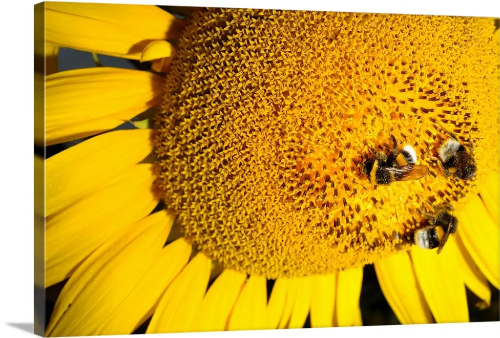 Canvas photo art of the up-close of a sunflower with a bubble bee sitting on top of the head.