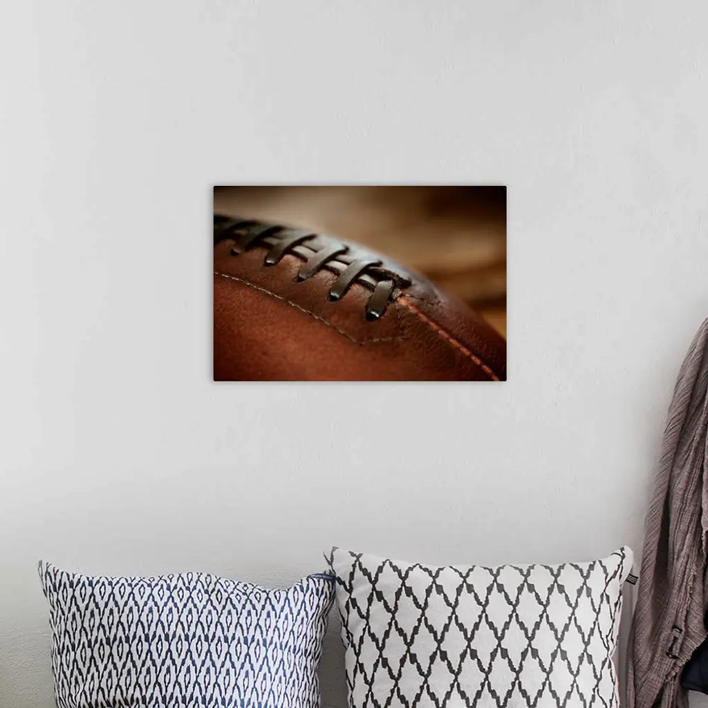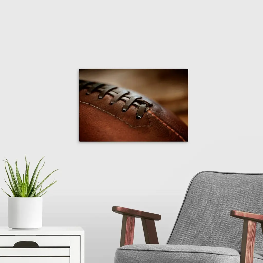 Decorative art for the home or office this photograph shows the details of the lacing and seam work on this leather ball.