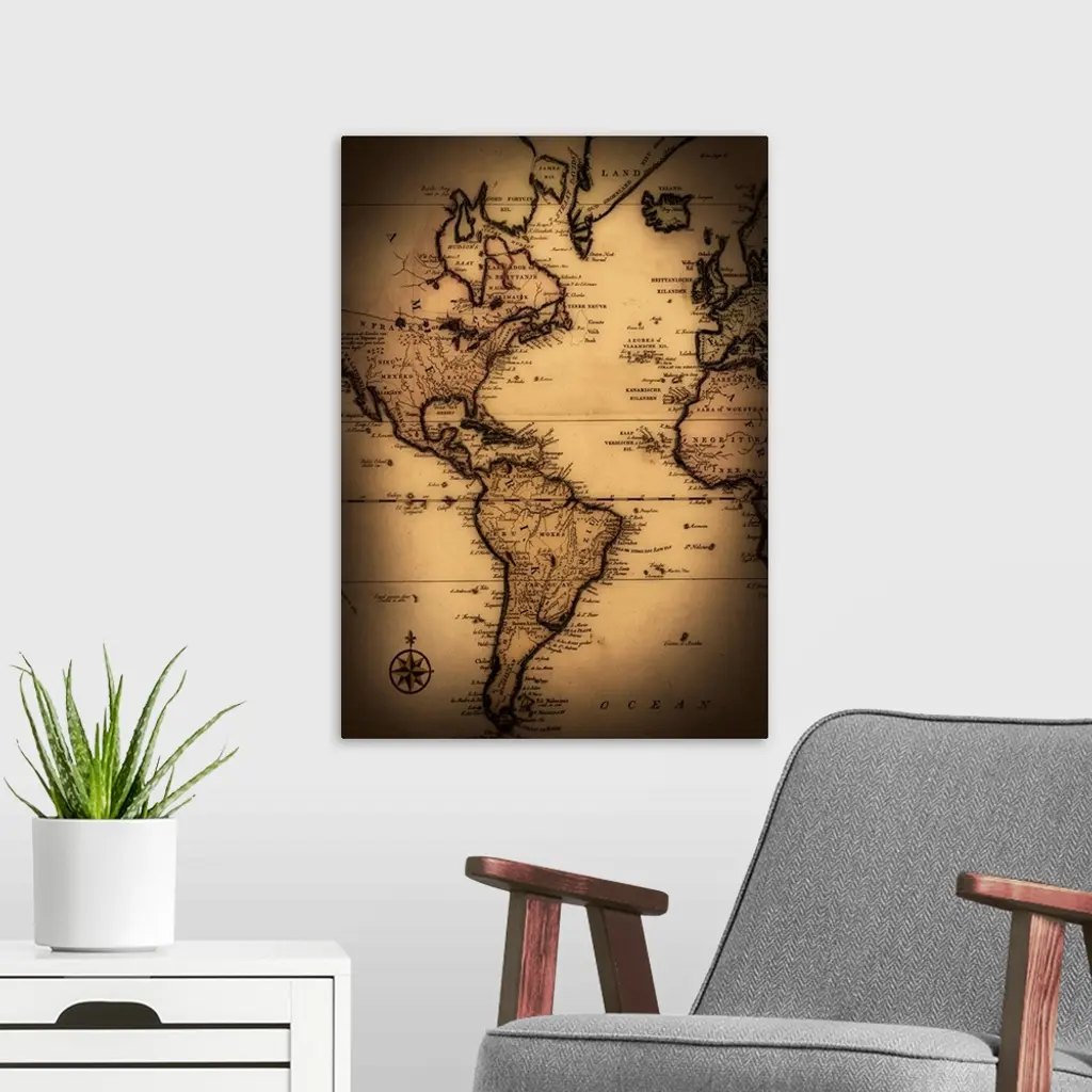 Giant monochromatic illustration centers mostly on North and South America within a vintage map of Earth. Artist labels the countries and bodies of water, as well as major cities within each country.