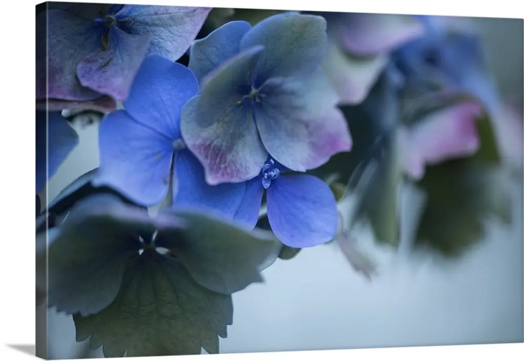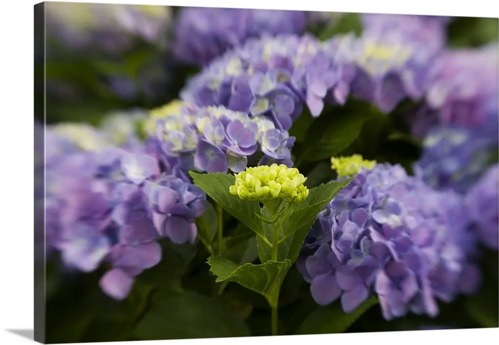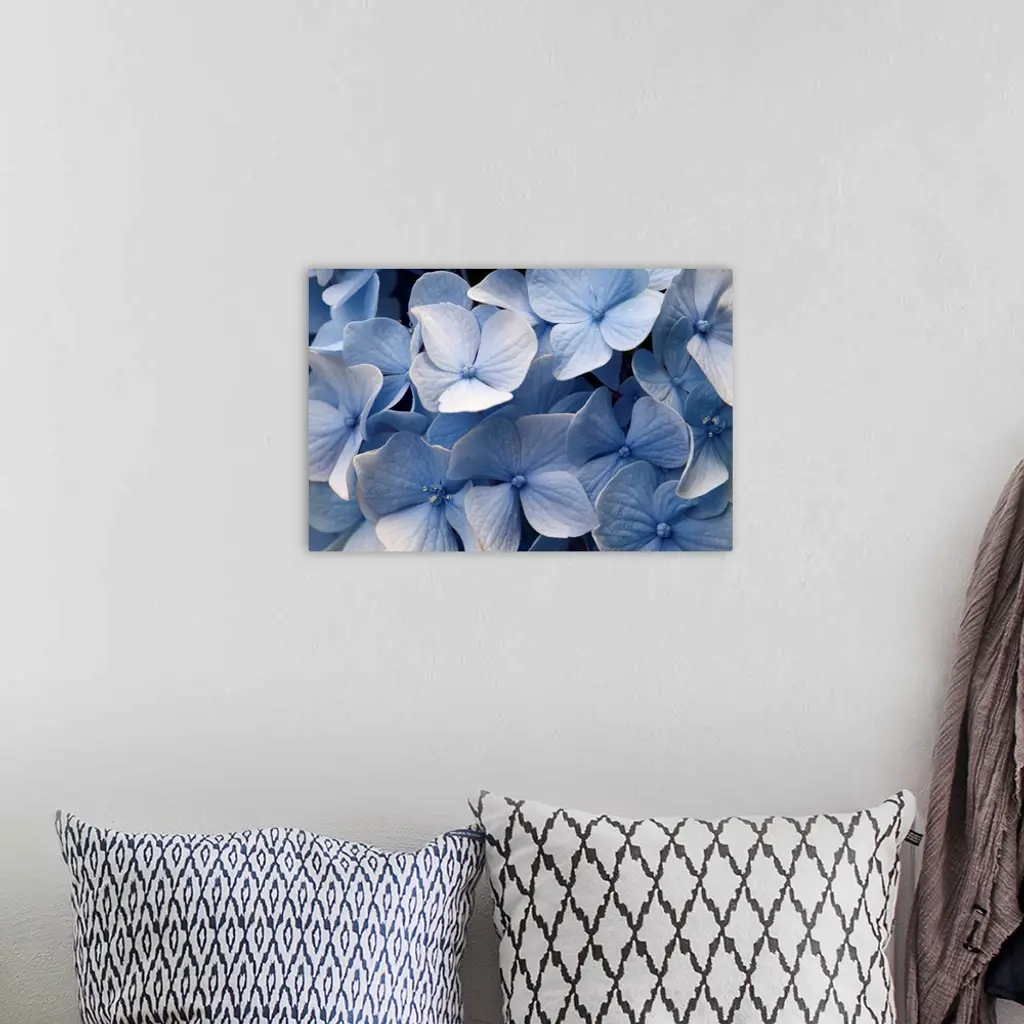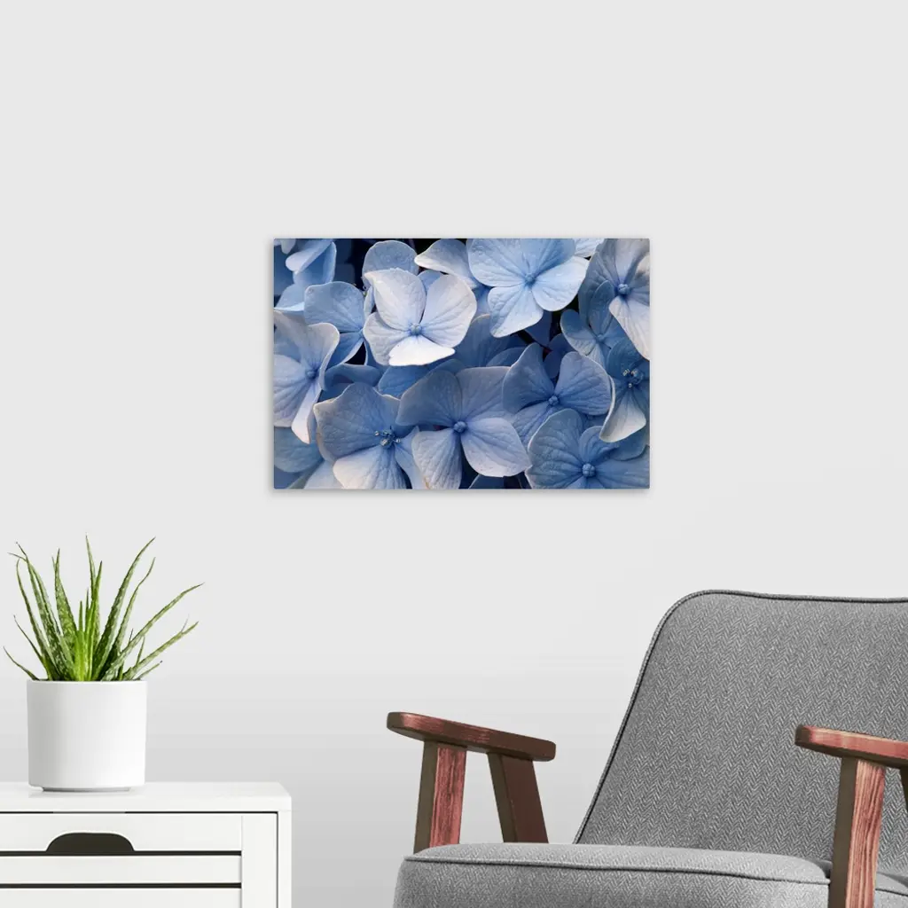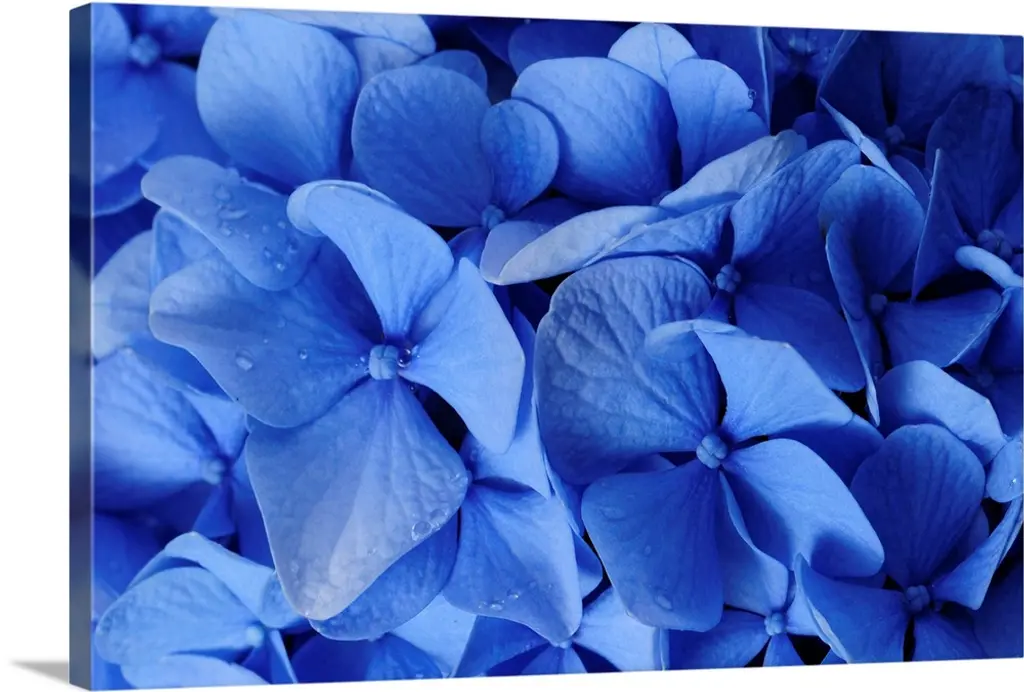 Landscape, large, close up photograph from the National Geographic Collection of a large group of blue mophead hydrangea flowers (Hydrangea macrophylla).