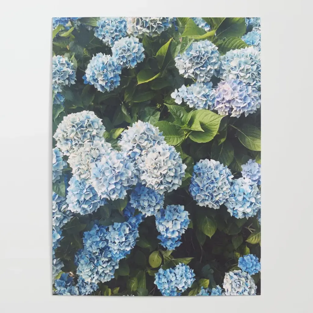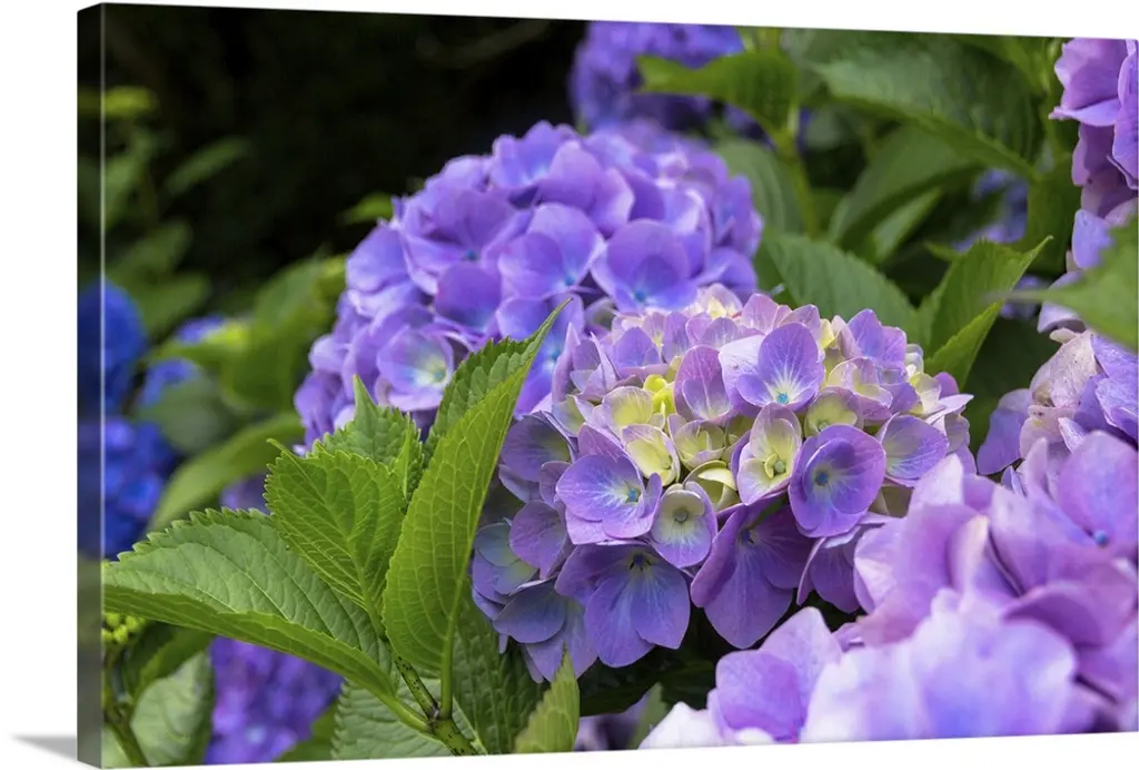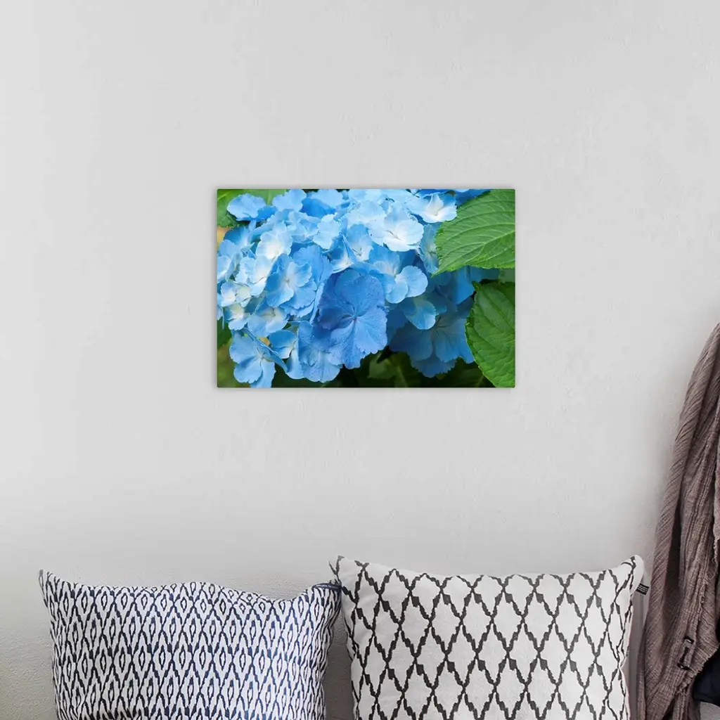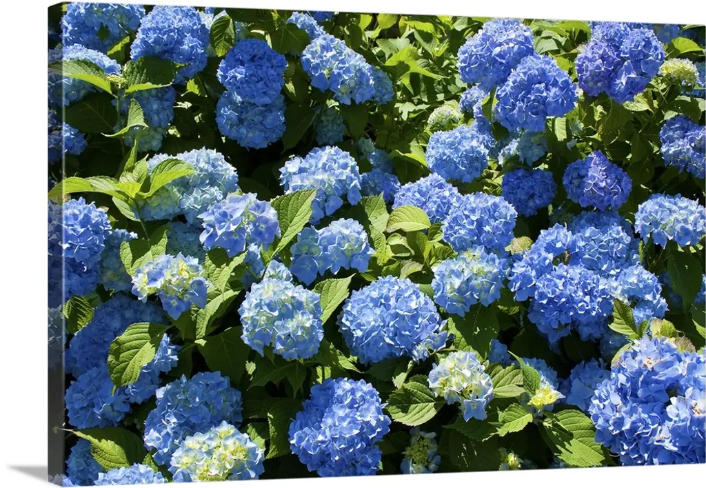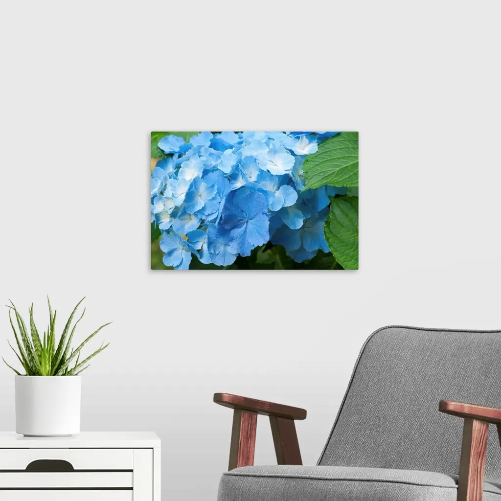 Close Up Of Blue Mophead Hydrangea Flowers, Hydrangea Macrophylla.; Brewster, Cape Cod, Massachusetts.