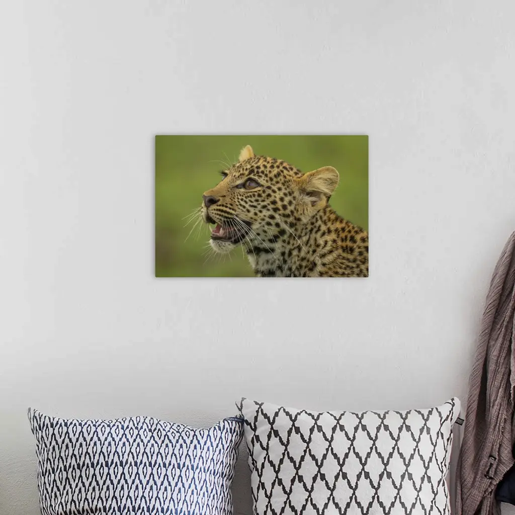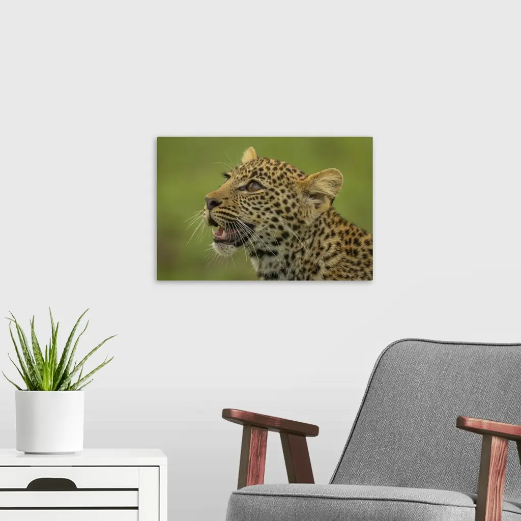 Close-up of Leopard cub (Panthera pardus) with mouth open in Maasai Mara National Reserve; Narok, Masai Mara, Kenya.