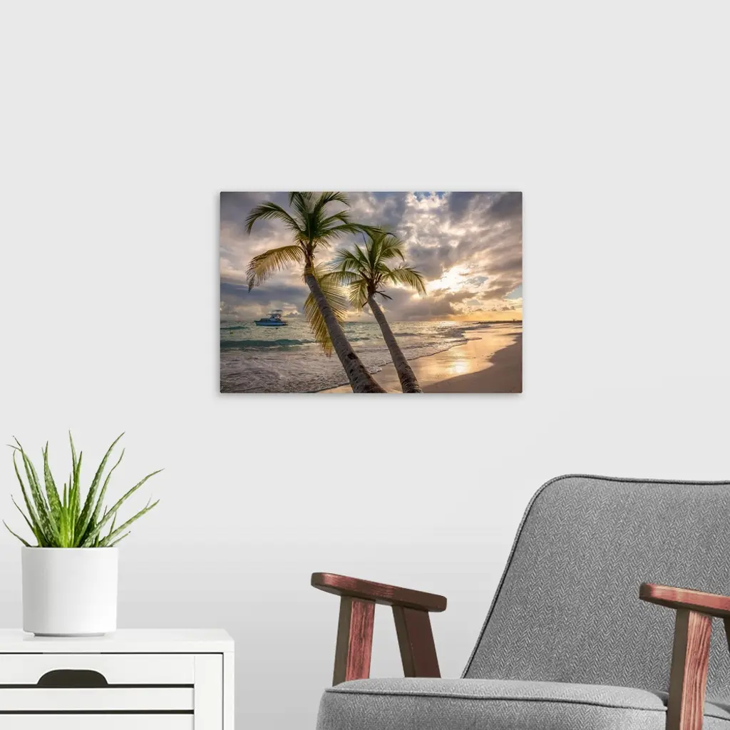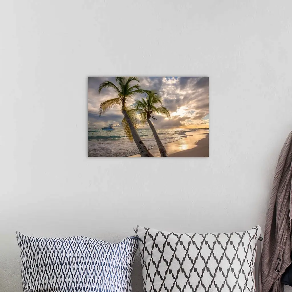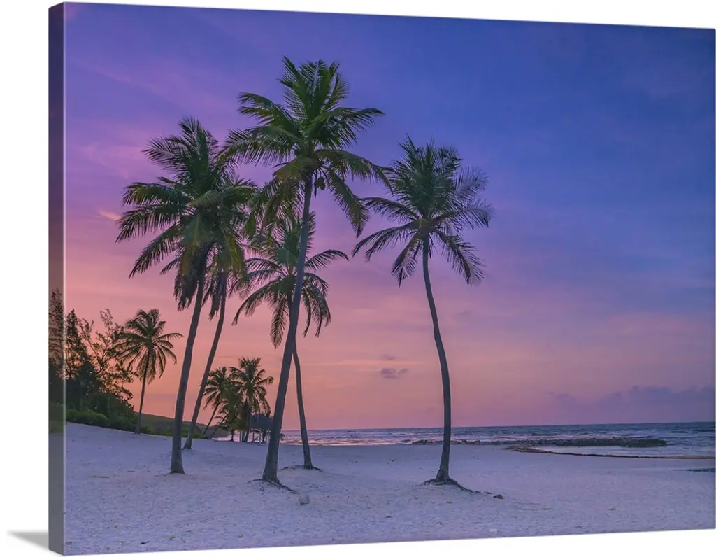 Close-up of palm tree with a yacht moored off shore and the turquoise water and foamy surf rolls onto the pristine white sand beach at twilight in the small village of Worthing, Worthing, Barbados, Caribbean