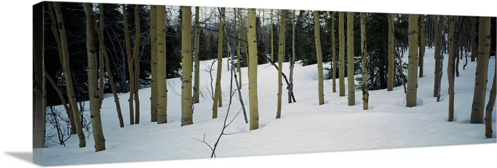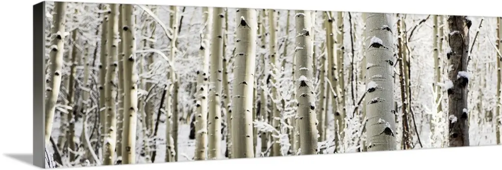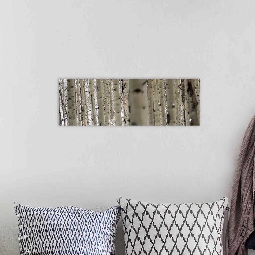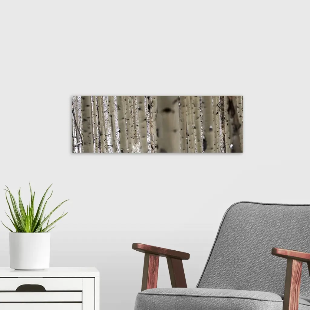 Close up panorama of slender birch trees in the snow in a forest in Aspen, Colorado.