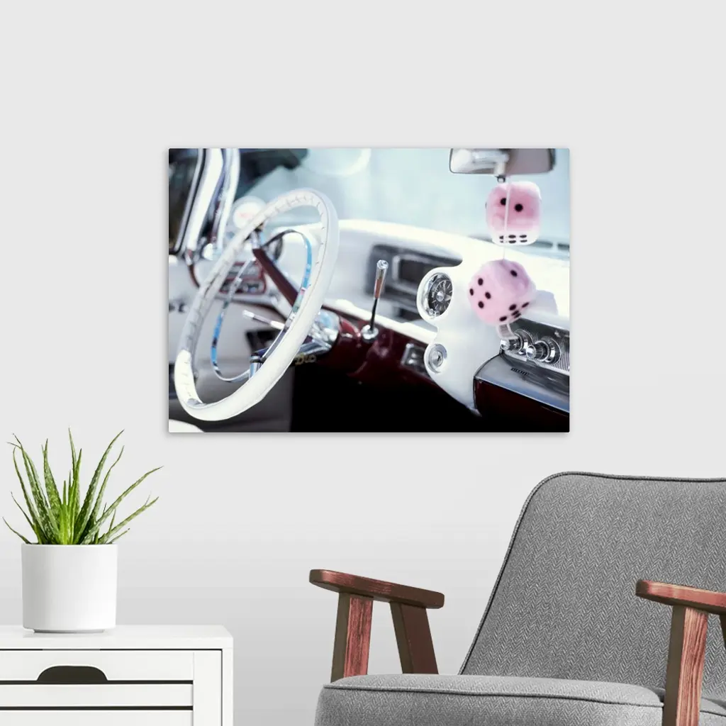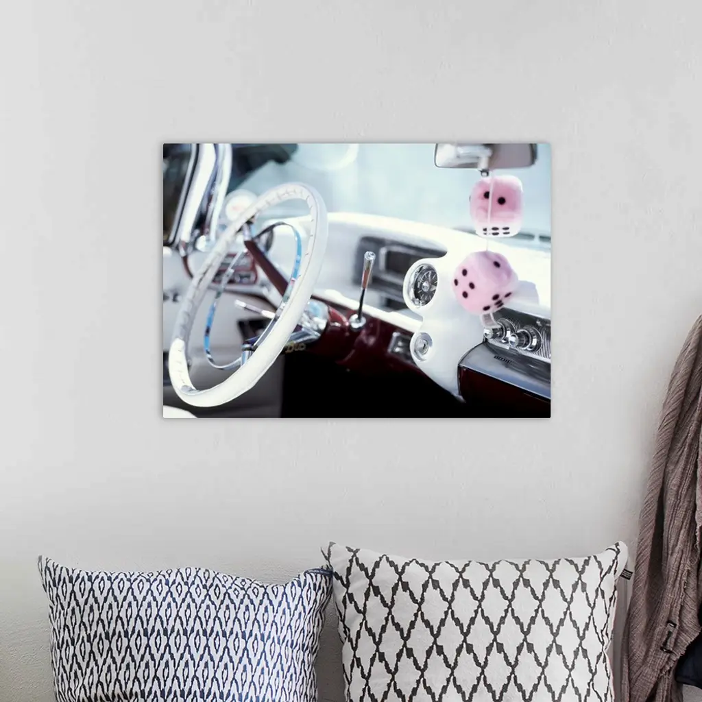Close-up of steering wheel and interior of a pink Cadillac car wall art for home and office decor. Discover canvas art prints, photos, mural, big canvas art and framed wall art in GreatBigCanvas.com's varied collections.