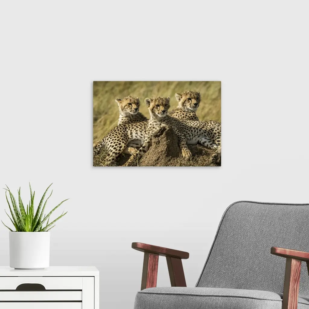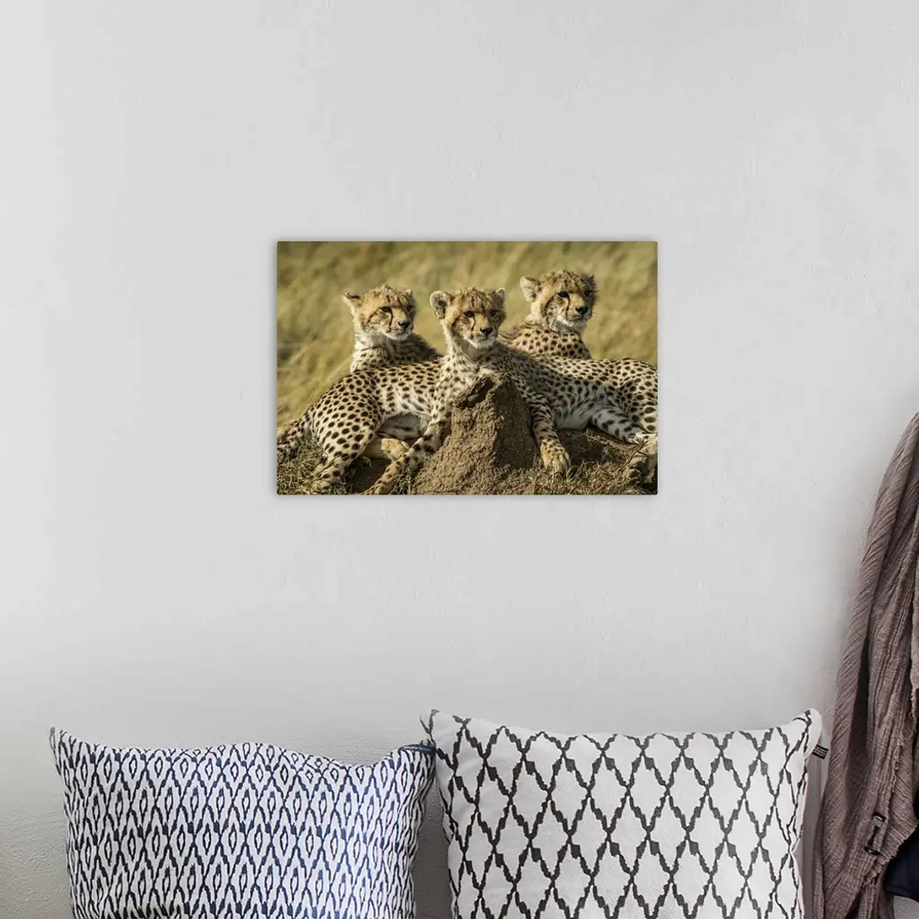 Close-up of three cheetah cubs (acinonyx jubatus) lying together, Serengeti, Tanzania.