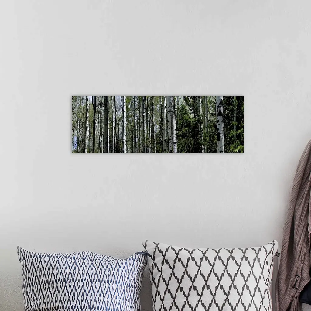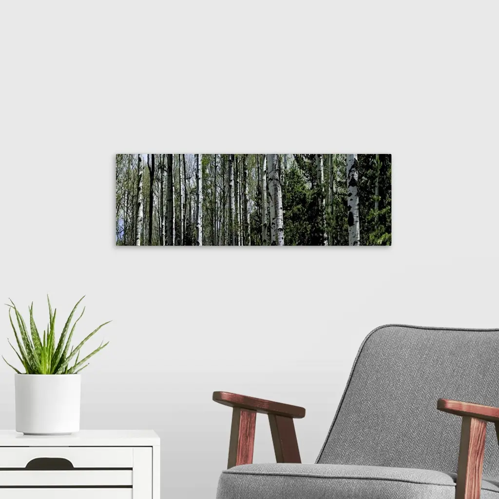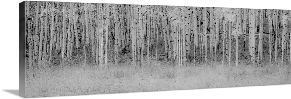 The trunks of trees are photographed in panoramic view with some tops of trees showing in the background.