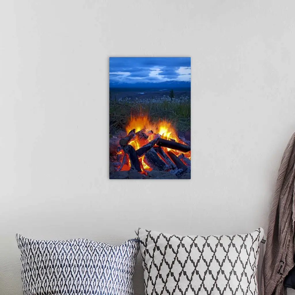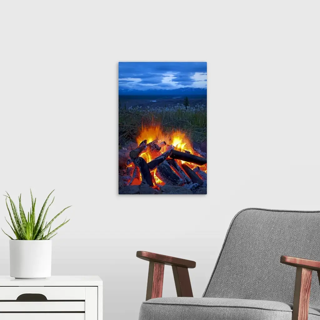 Close Up View Of A Camp Fire With A View Of The Chugach Mountain In The Distance