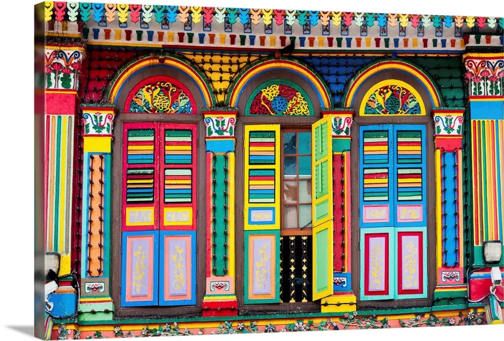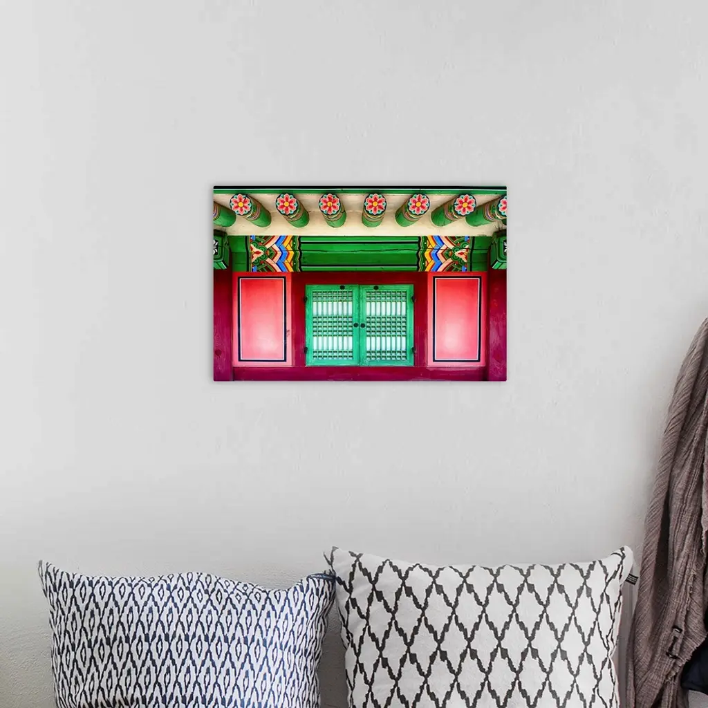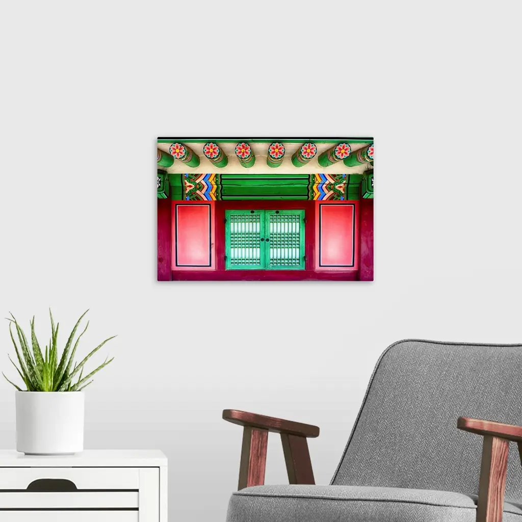 Intricately painted beams and window shutters on the Royal Palace in Seoul, South Korea