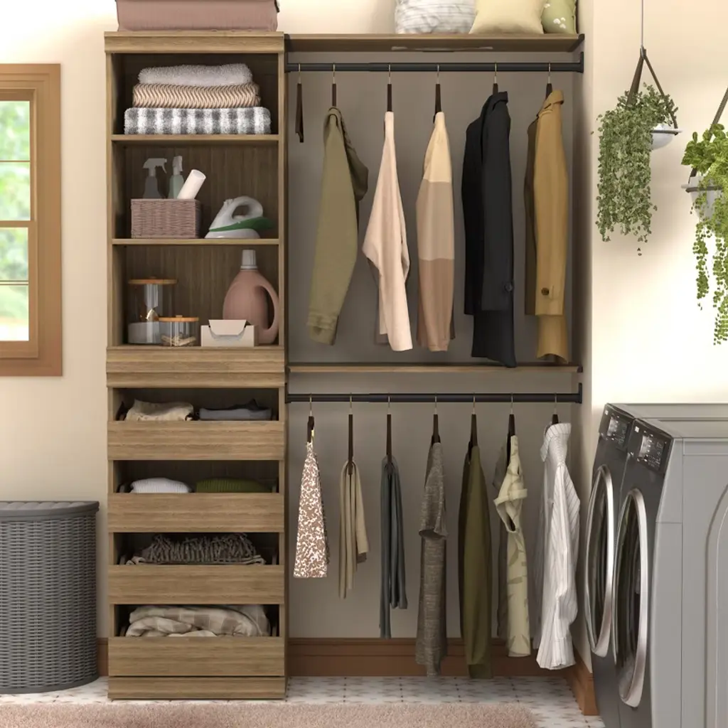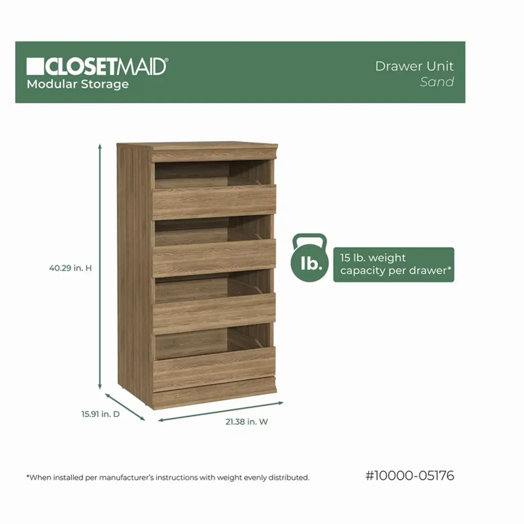 Add a touch of style to your storage with ClosetMaid's Modular Storage 4-Drawer Unit. Its four pull-out drawers, decorative trim, and full backer make it a chic and practical storage solution. Stack it with compatible Modular Storage shelves or combine with accessories like top shelves, hang rods, and door kits to create your dream custom closet with ease.