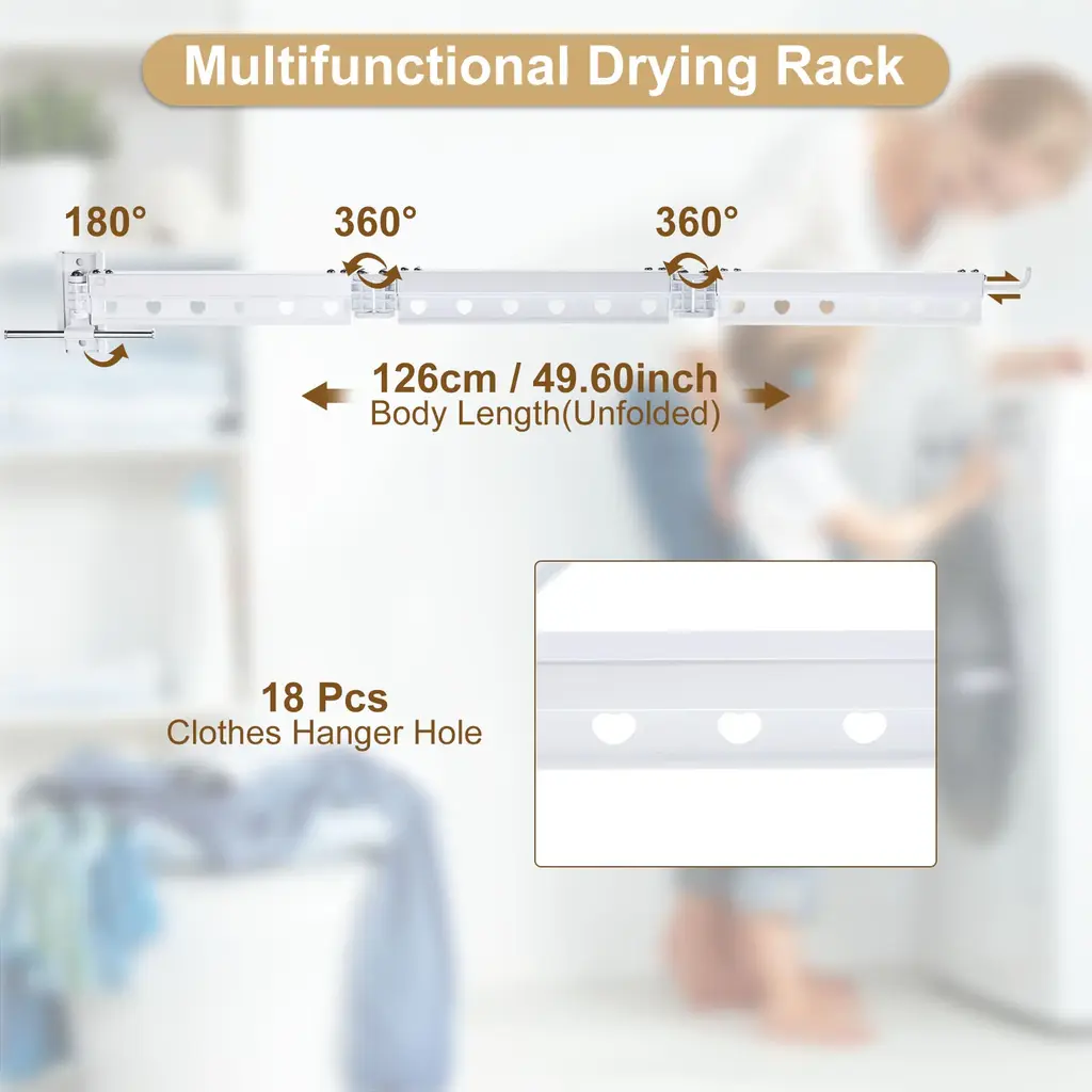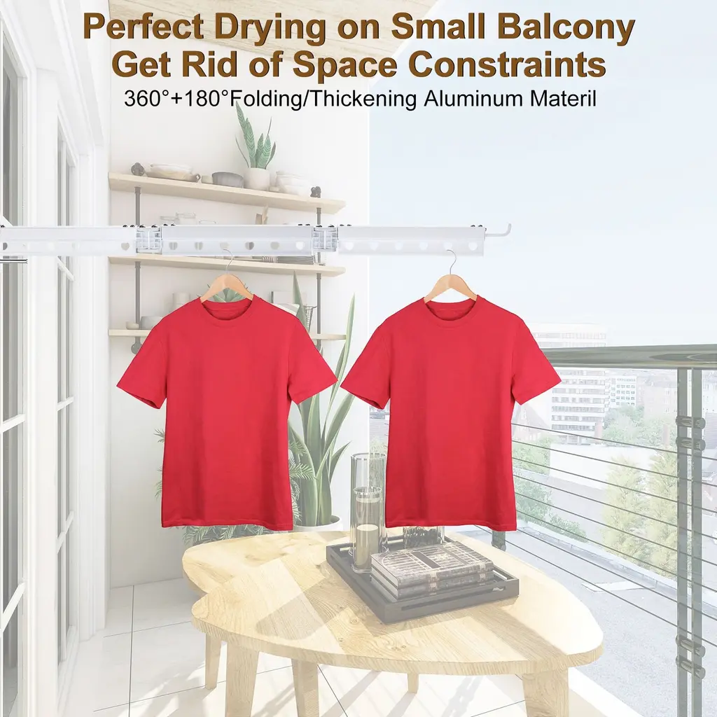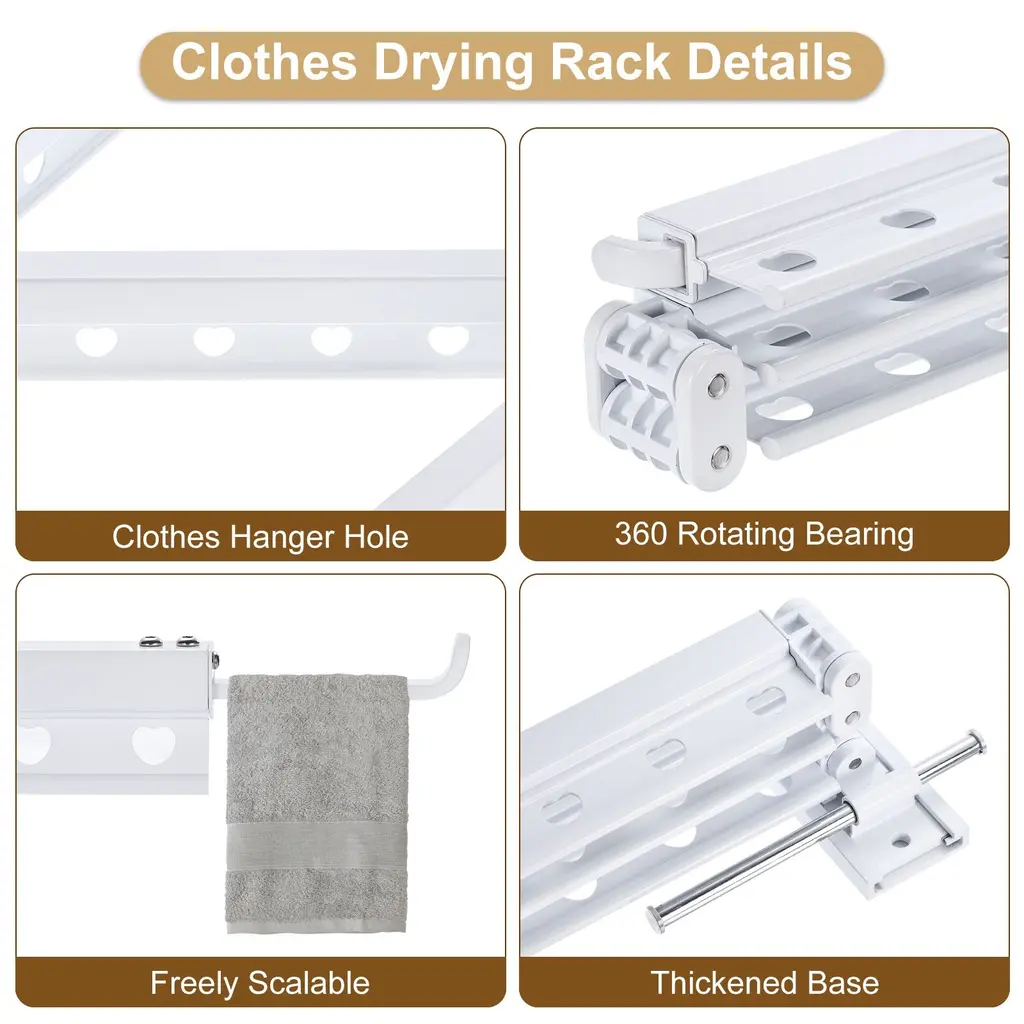 You can put this clothes drying rack on your balcony, bathroom, laundry room, or by the window of your bedroom.Specification:Material: aluminum alloyColor: WhiteFold Length: 36.5 cm/14.4 inchOpen length: 126 cm/49.60 inchWidth: 9 cm/3.54 inchPackage Included: 1 Set Clothes Drying RackAdvantage:The clothes drying rack is made of aluminum alloy, waterproof and rust-proof, corrosion-resistant, sturdy, and durable.This retractable drying rack can rotate 360 degrees, has unlimited space angle rotation, cross lock design, not easy to slide.Our wall mounted clothes drying rack features collapsible design that can be easily folded and stored away when not in use.The clothes hanger rack comes with 4 screws to help you fix it firmly. This clothes hanger needs to be drilled and installed.You can use them to hang jeans, shirts, pants, jackets, dress, belts and etcNote: Manual measurement, please allow slight errors on size.The color may exist a slight difference due to different screen displays.