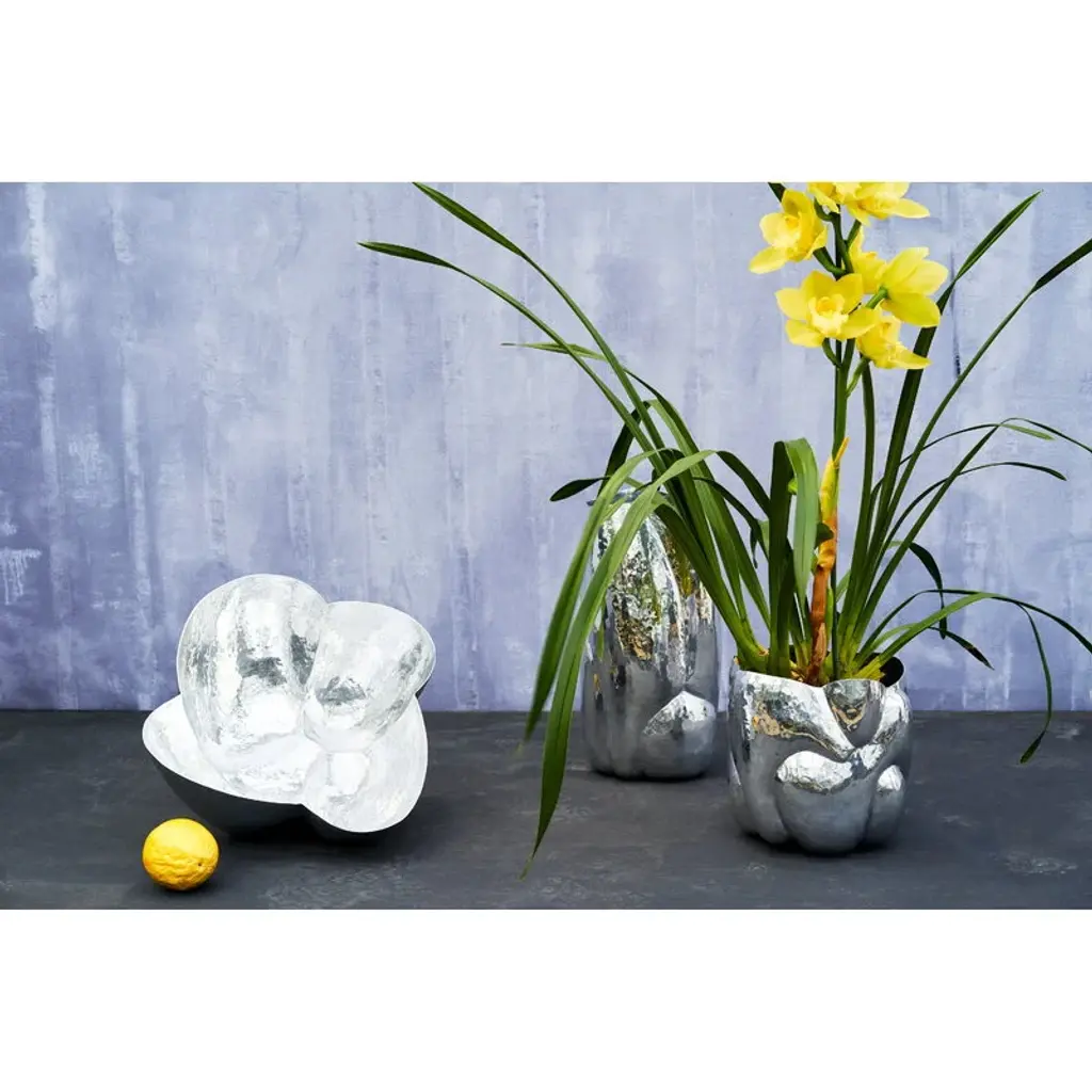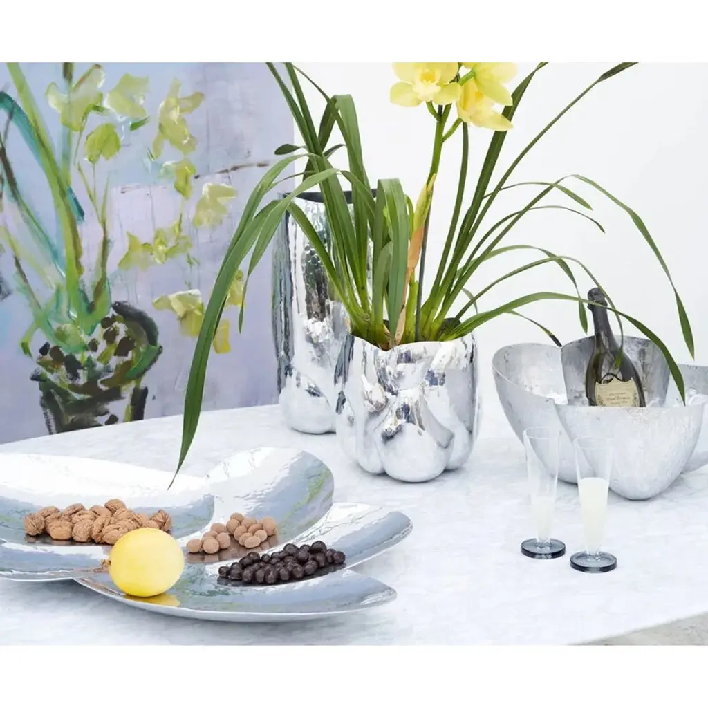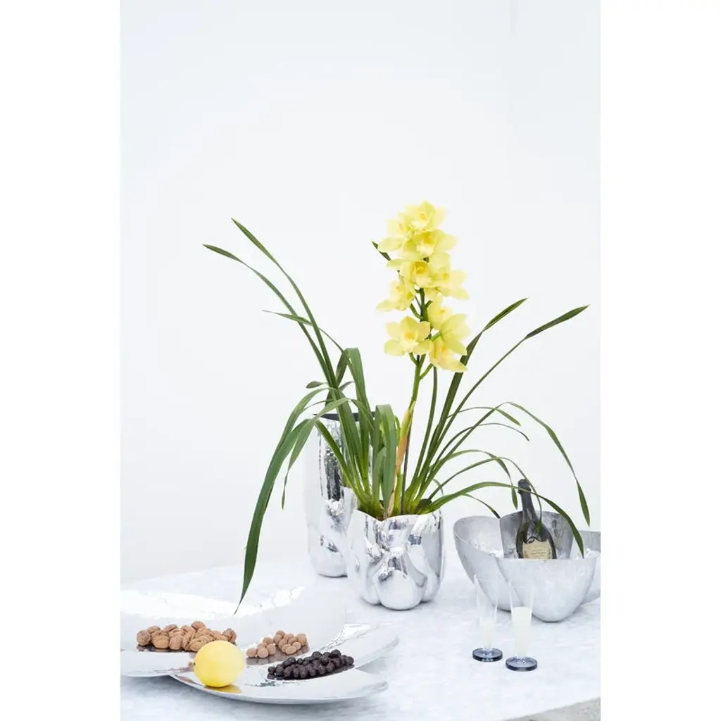Tom Dixon's Cloud vessel was born from the designer's desire to create something round and asymmetrical simultaneously. Borrowing its shape from a fruit seed, the waterproof Cloud bowl is ideal for beautiful floral arrangements. You can also use the tall Cloud vase as a champagne cooler at parties – but watch out, as the eye-catching vessel could well become the talk of the party! The striking Cloud vessels are made by hand from aluminum sheets. The marks left by stretching, twisting, and hammering the metal are allowed to remain visible on the surface of the reflective vase. The handcrafted finish gives each vessel its own unique look.