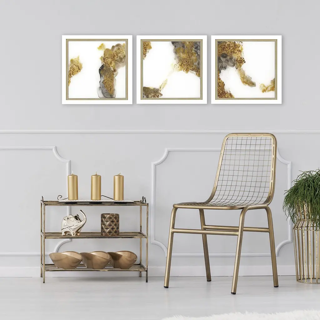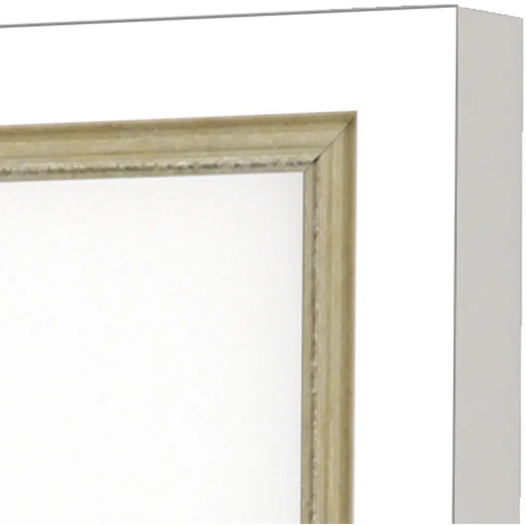 Exclusive reverse hand painted on acrylic with gold mica flakes. Framed in a lacquered white wood shadow box style with a champagne gold wood liner.