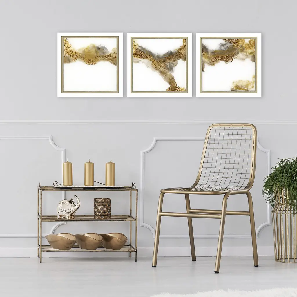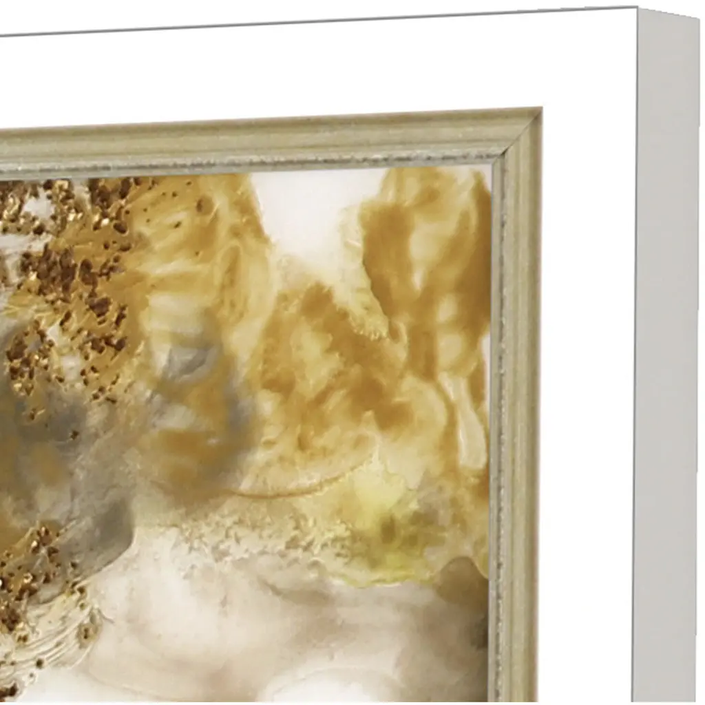 Exclusive reverse hand painted on acrylic with gold mica flakes. Framed in a lacquered white wood shadow box style with a champagne gold wood liner.
