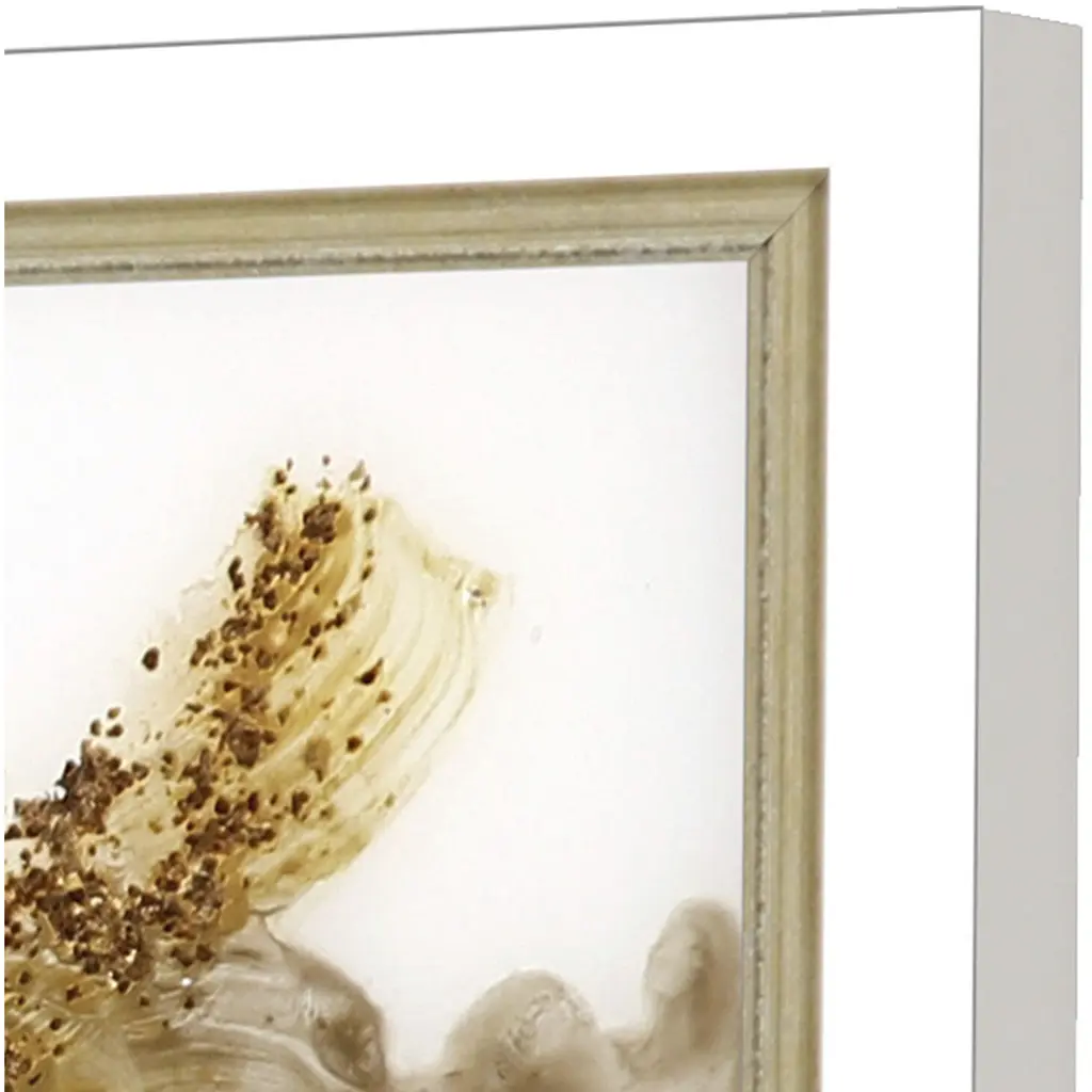 Exclusive reverse hand painted on acrylic with gold mica flakes. Framed in a lacquered white wood shadow box style with a champagne gold wood liner.