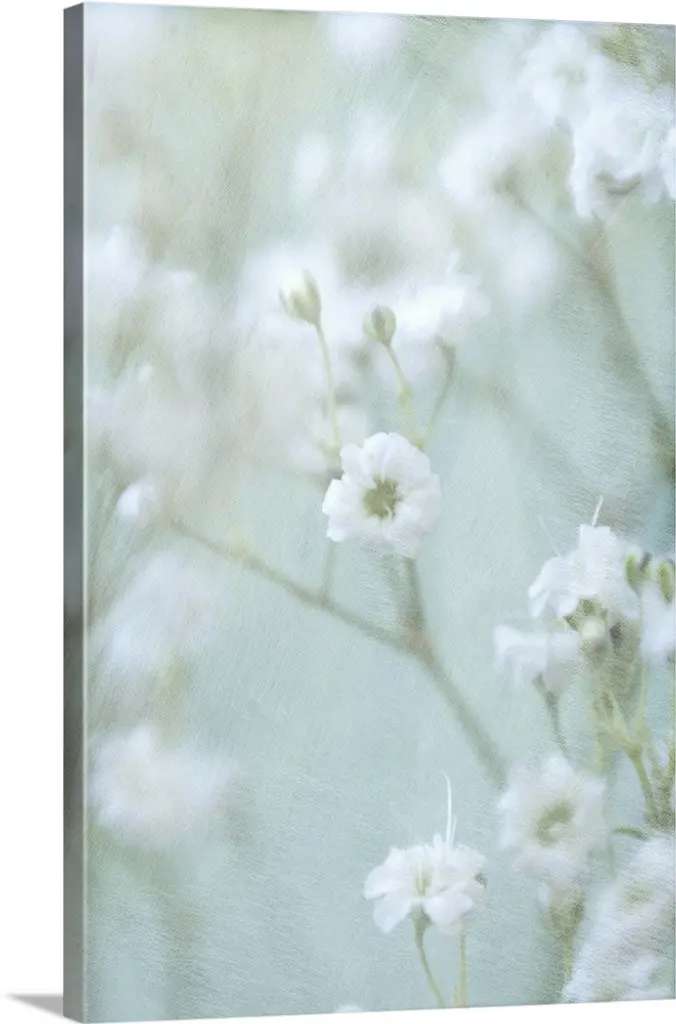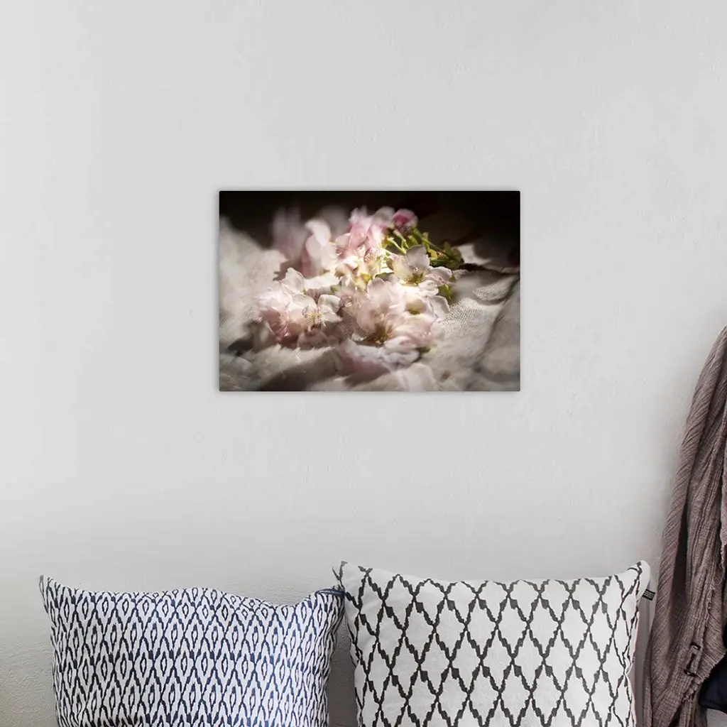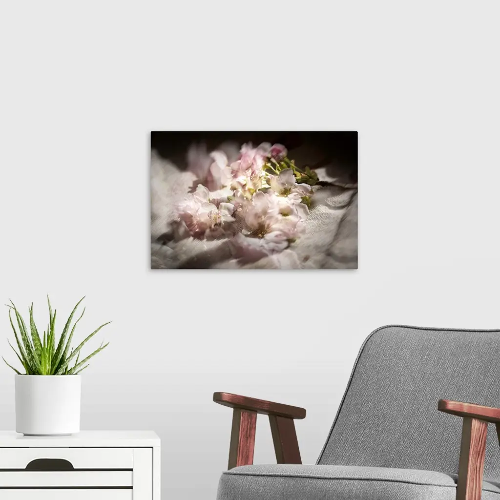 Dreamy photograph of cherry blossom flowers on linen with multiple exposures.