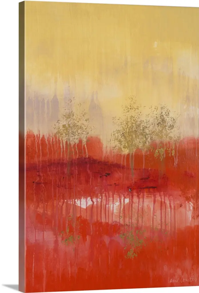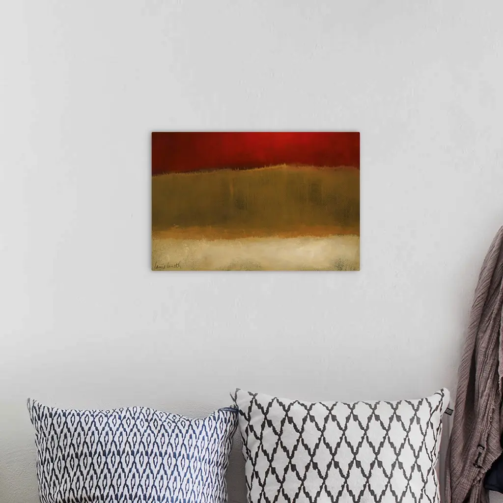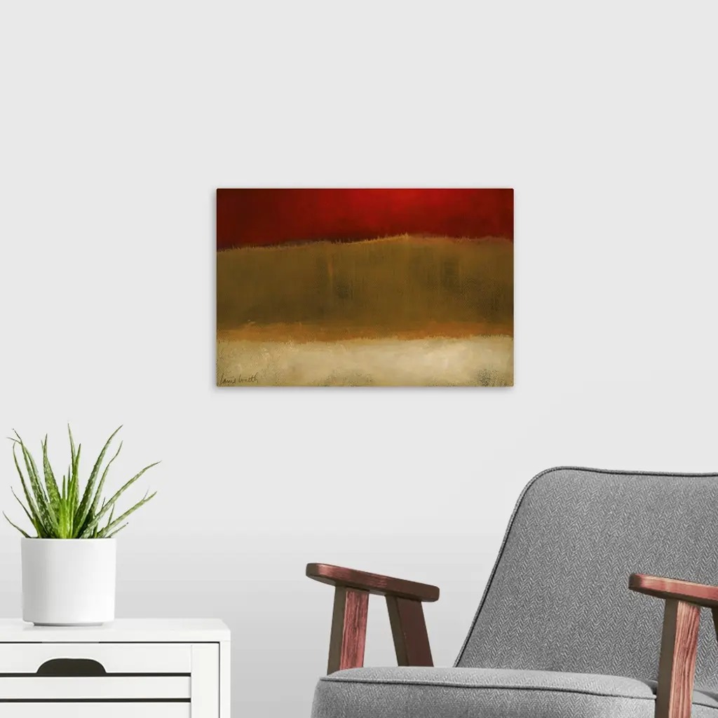 Big abstract art incorporates three rectangular sections of earth toned colors with frayed edges that are stacked on top of one another.