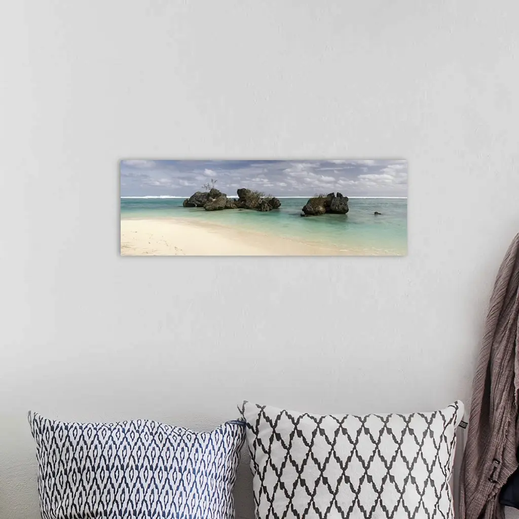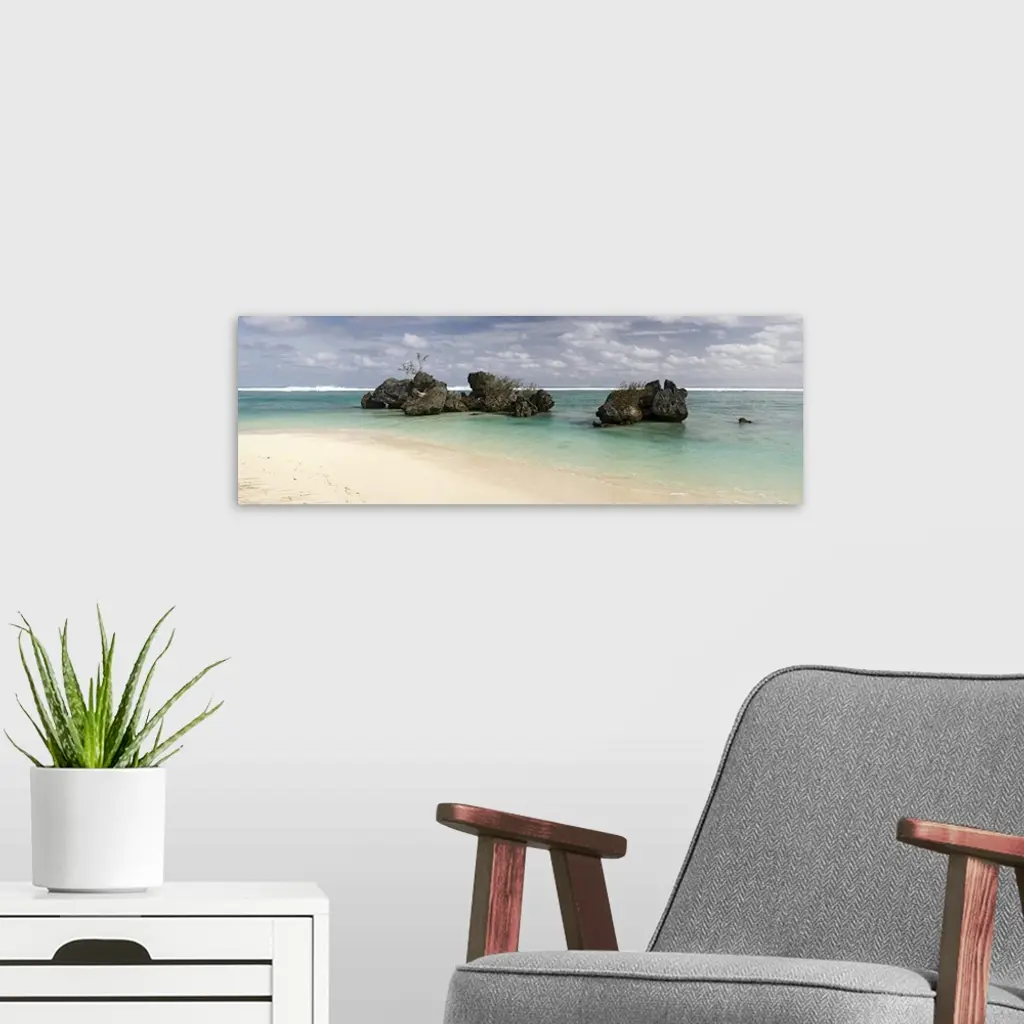 Long horizontal image print of a clear ocean washing ashore past big rocks sticking out of the water.