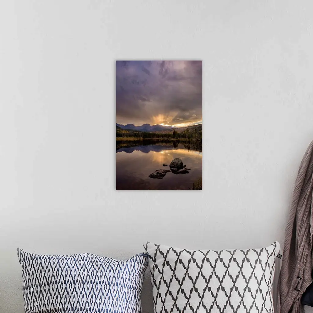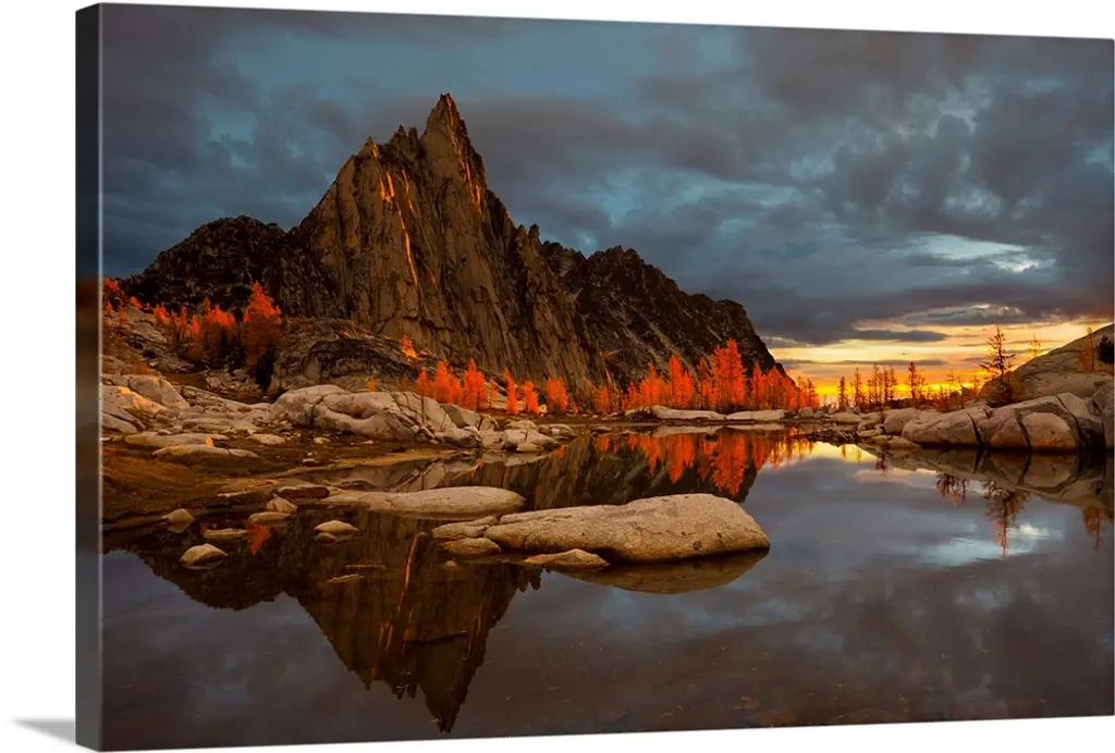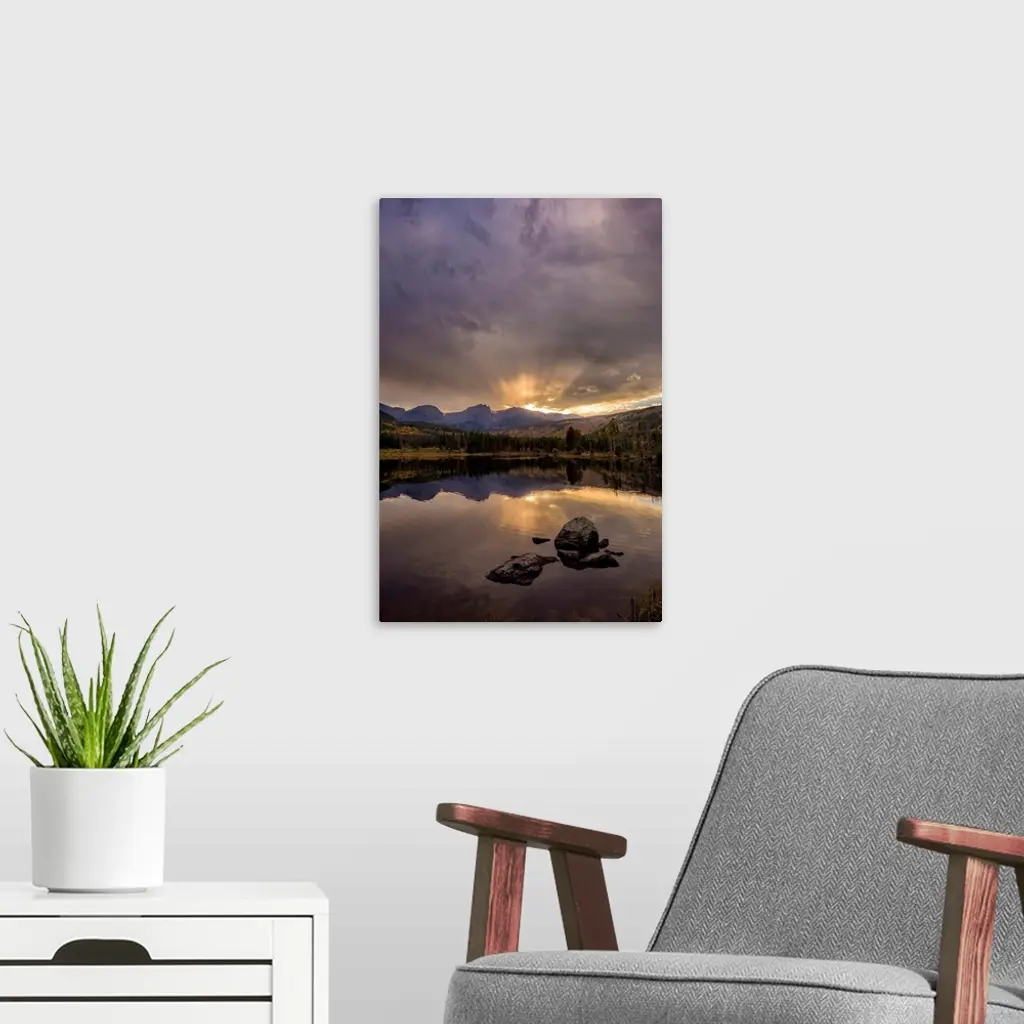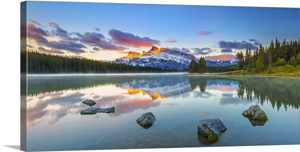 Landscape photograph of trees and mountains reflecting onto a calm lake at sunset.
