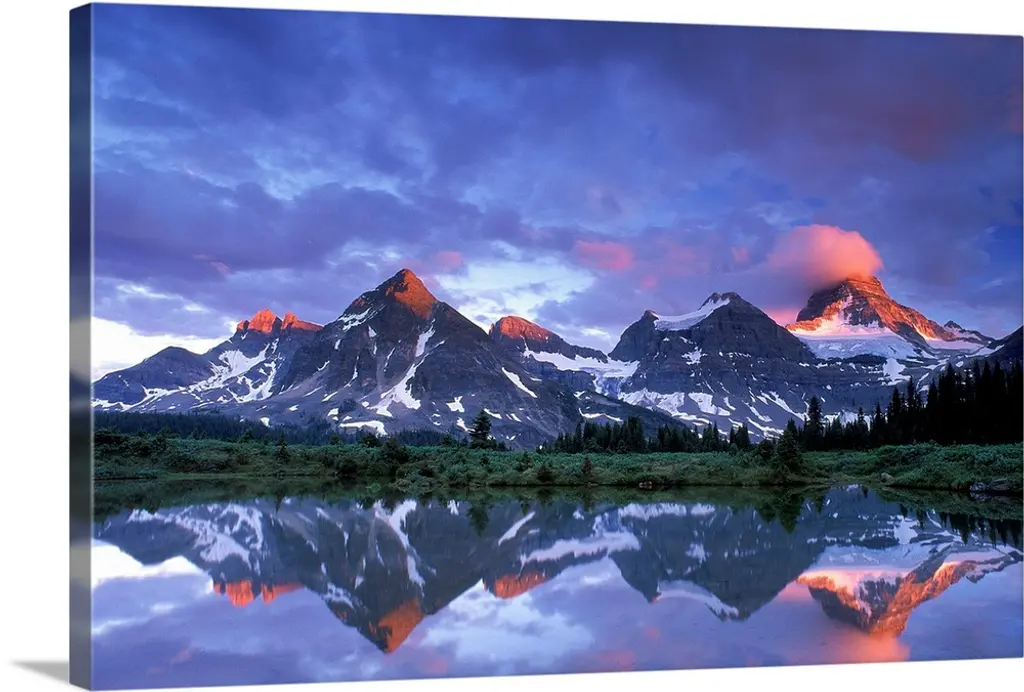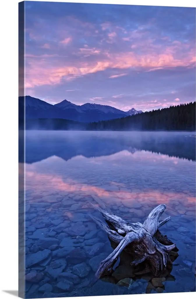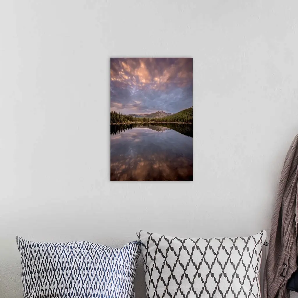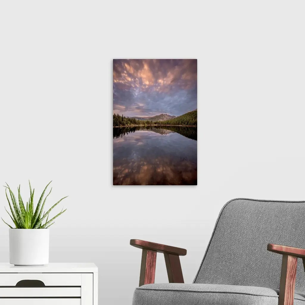 Landscape photograph of trees and mountains reflecting onto a calm lake at sunset.