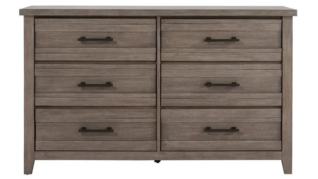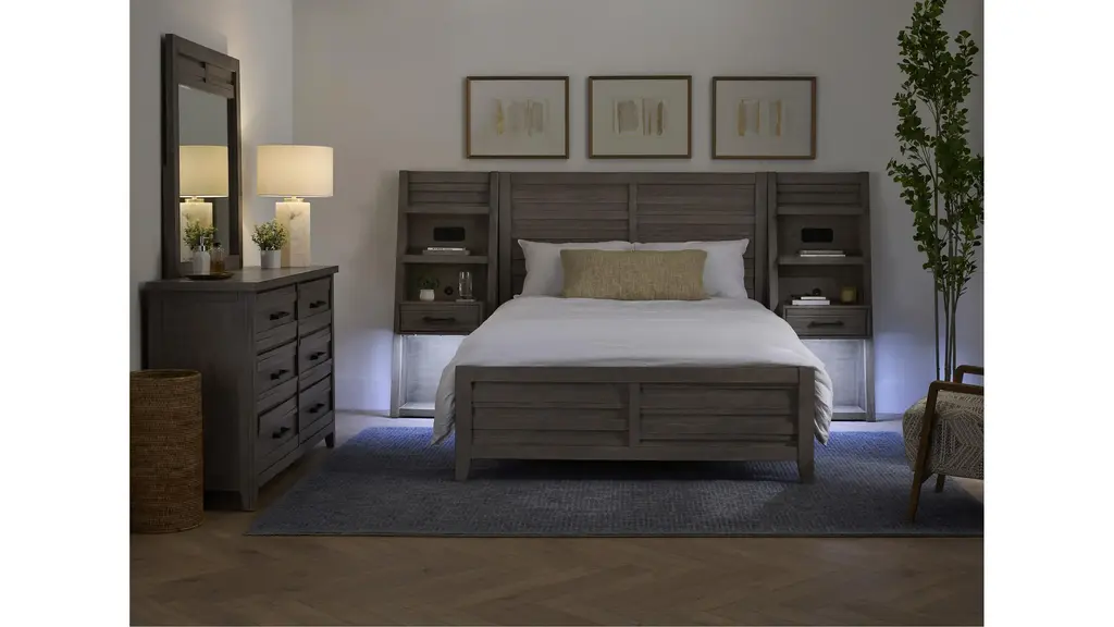 Rustic charm meets modern edge in the Clouston 5-pc. Wall Bed Set. Designed with a warm finish, horizontal stacked banding, and antiqued metal drawer pulls, it brings a fresh, laid-back vibe to your home. Two fixed shelves and a drawer in each pier offer essential storage space, while USB/USB-C charging, Bluetooth speaker, and LED base lighting take it up a notch in terms of function. Includes bed, dresser, mirror, and two pier nightstands.