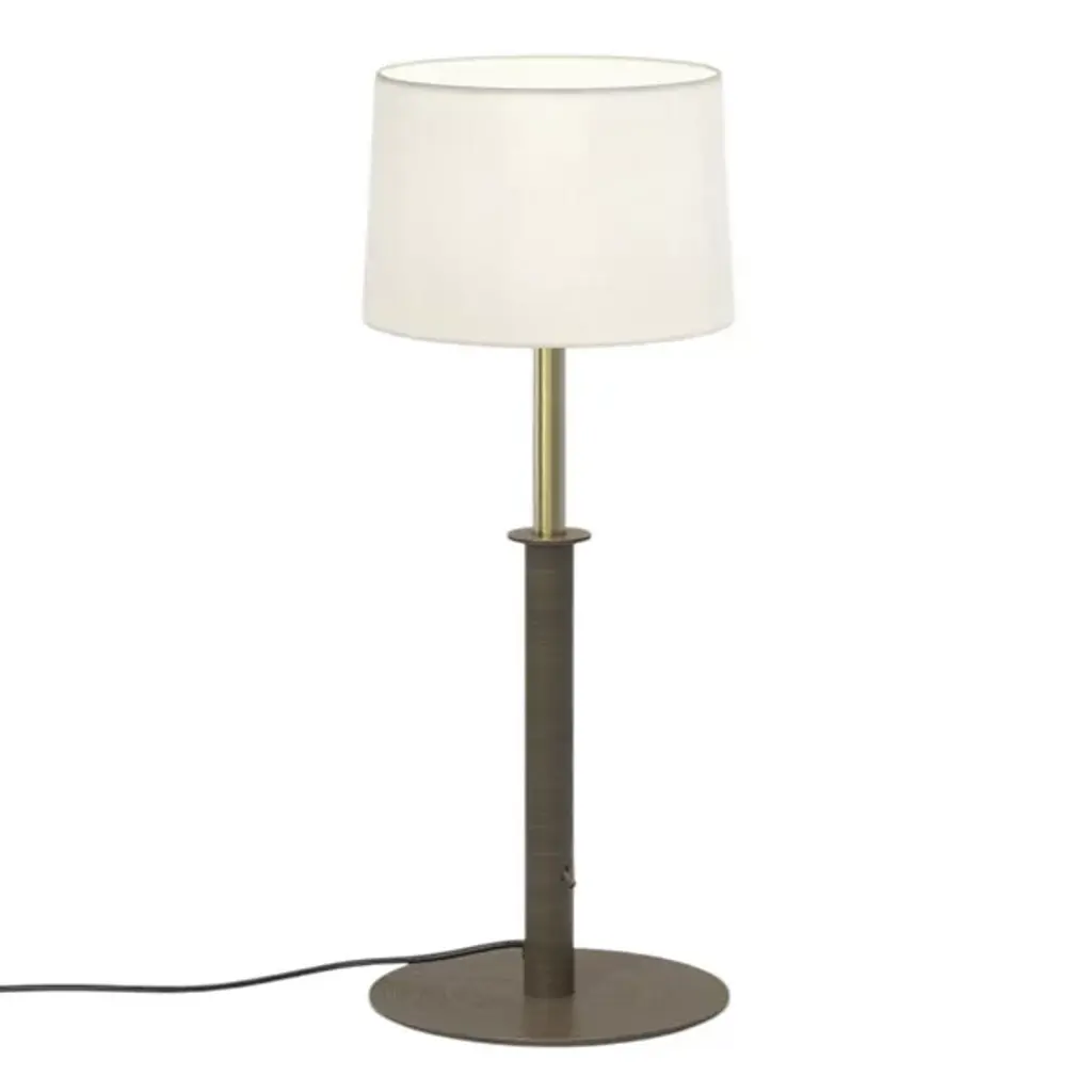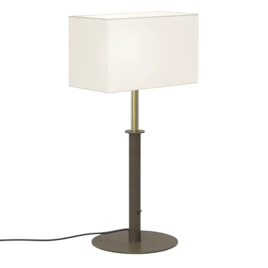 The Club Table Lamp with Rectangle 285 Shade from Astro Lighting features a modern character with a steel structure finished in bronze, designed to cast a warm glow that is ideal for tables, desks, and more. Created with Astro's proprietary QuickBase system, the base attaches in seconds for easy assembly, while enhanced engineering allows easy cable routing behind furniture. A rectangular fabric shade diffuses light evenly, with solid brass accents adding a bit of rich refinement that glitters among the even ambiance the light casts.
