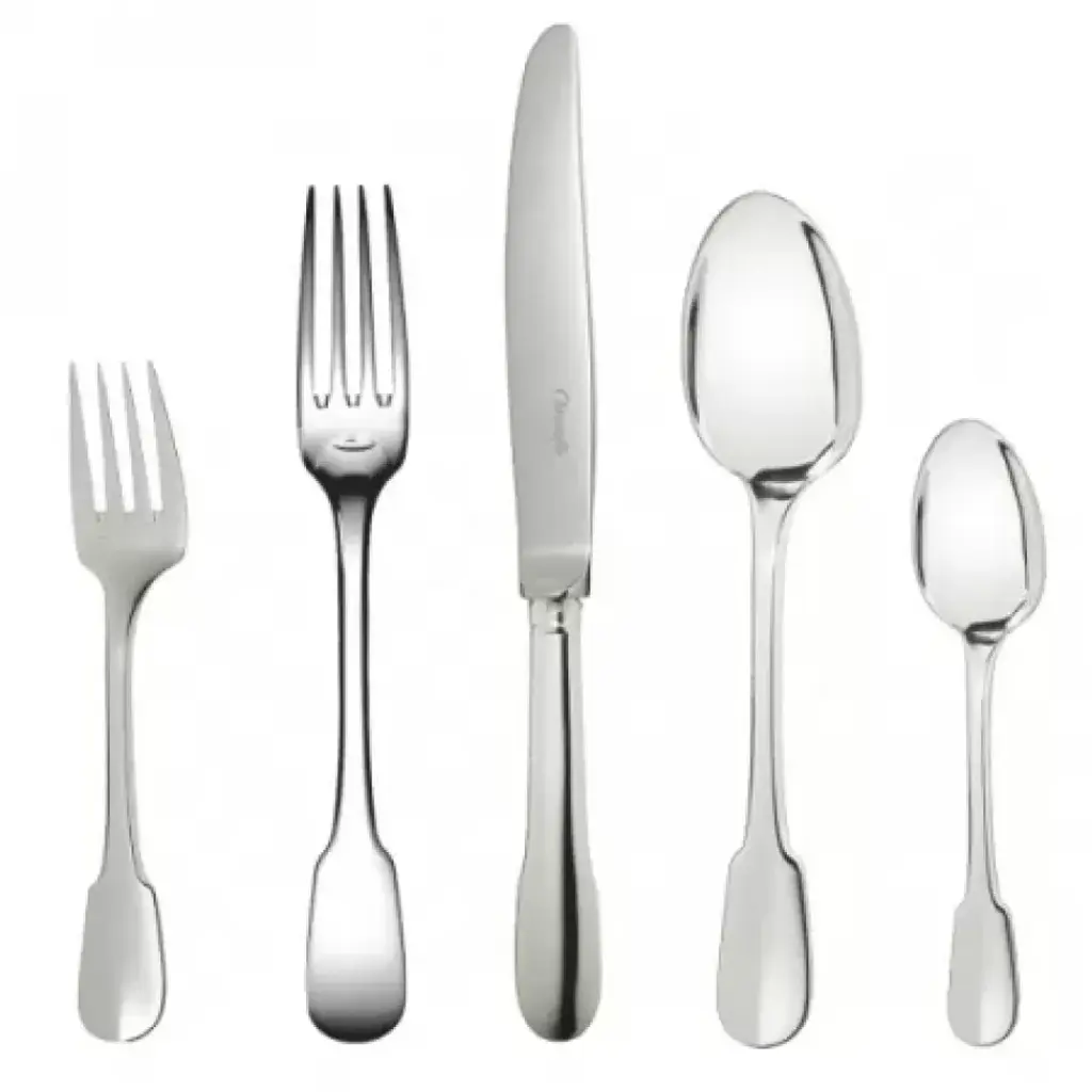 The silver plated cheese knife in the Cluny pattern also has two teeth at the end to pick cheese off of a cheese plate. The simple and elegant Cluny collection, which dates back to Christofle‘s first catalog in 1862 when it was known as Uni, was slightly redesigned in 1964. It still maintains an overall Louis XIII feel and is a blank canvas for personalization. Thanks to its creations in silver, Christofle is a symbol of luxury and elegance. Since its founding in the mid-19th century, it has been a continous innovative force and has infused each era with a new art of living. Thus, over time, this prestigious company has revolutionized styles, techniques, and methods for the production and distribution of silver plate and the decorative arts. A player in and privileged witness to the evolution of taste, customs, and traditions, Christofle has always seen its name associated with major creative trends, renowned artists such as Man Ray or Jean Cocteau, avant-garde architects such as Gio Ponti, and modernist silversmiths such as Lino Sabattini and Christian Fjerdingsatd, as well as present-day designers such as Andrée Putman, Martin Szekely or Ora ïto. Today, as in the past, whether gracing the tables of emperors, princes, or maharajas, in palaces, on board the Trans-Siberian Railway, Orient Express, or transatlantic ocean liners, or in the contemporary restaurants, Christofle continues to make an impression.