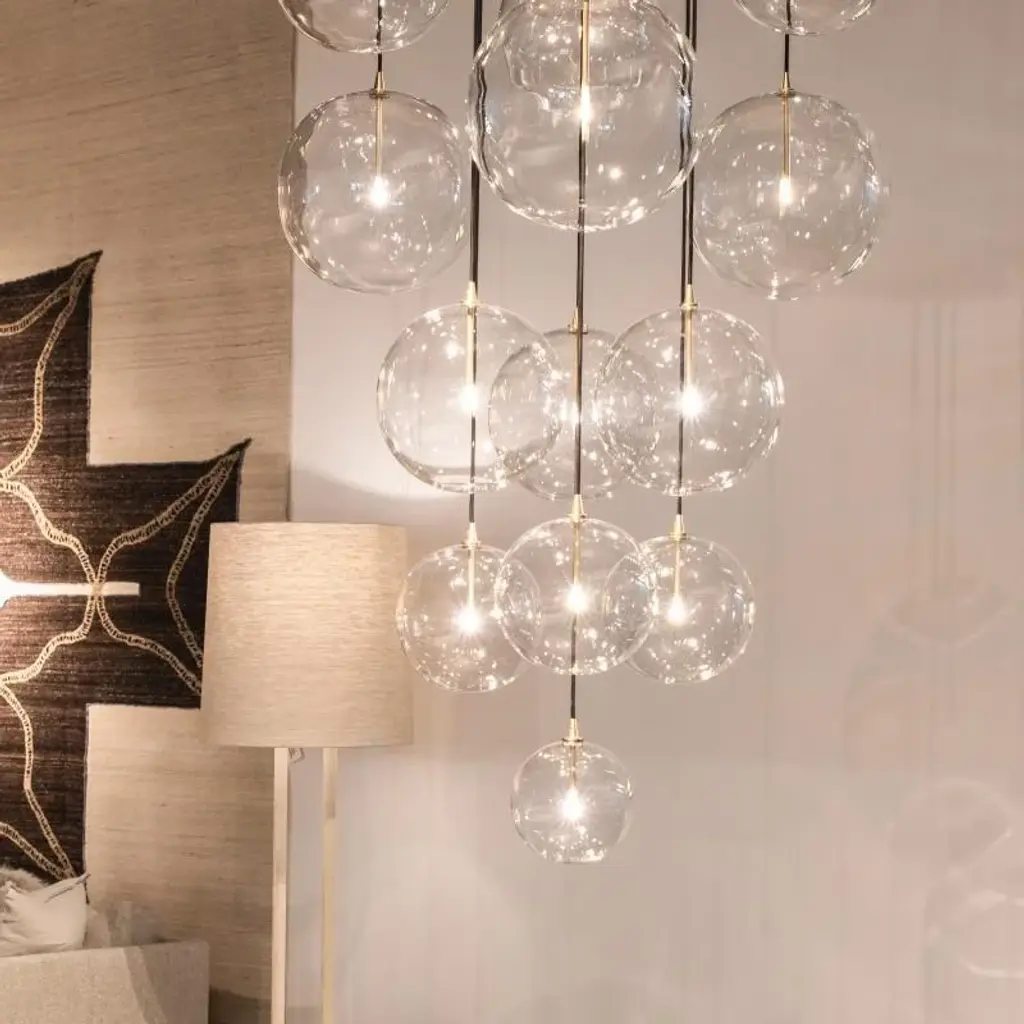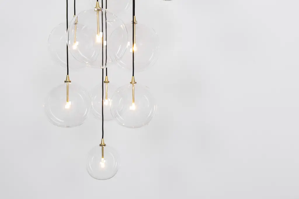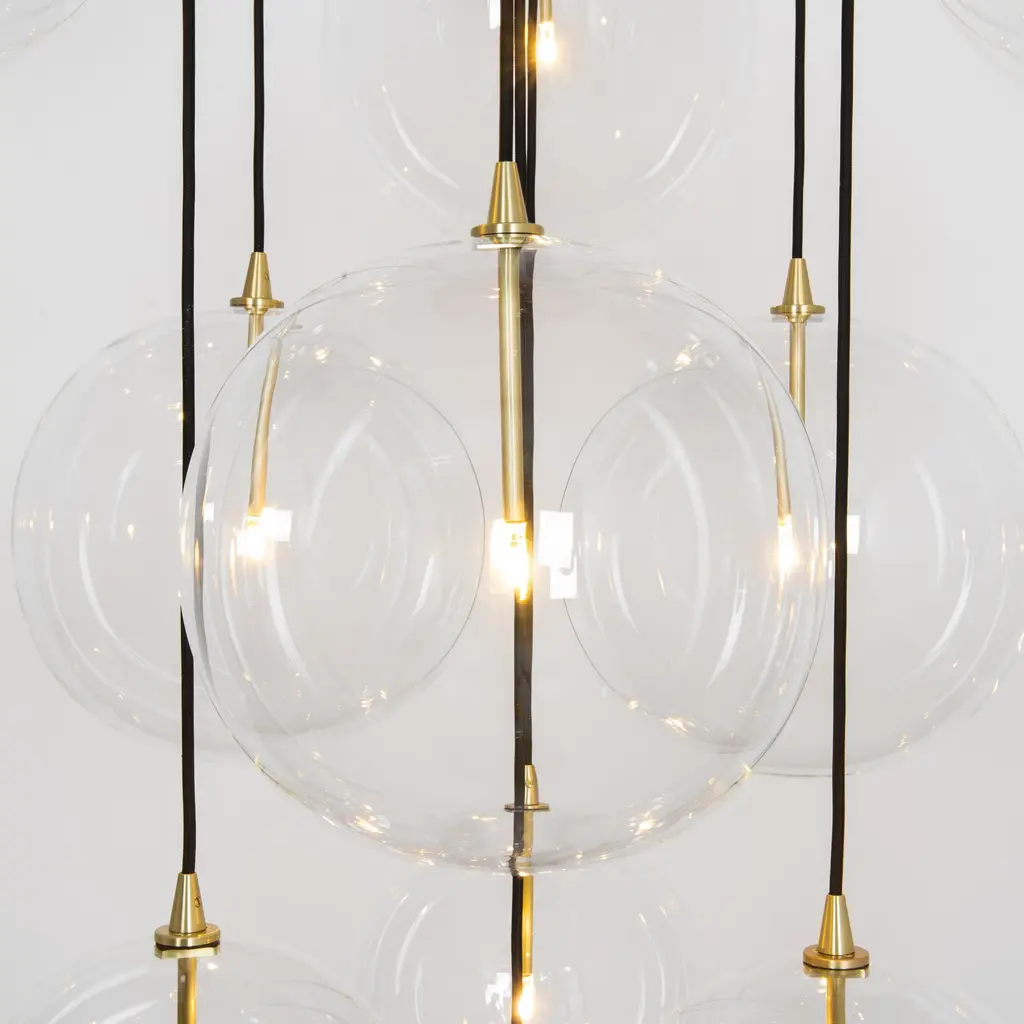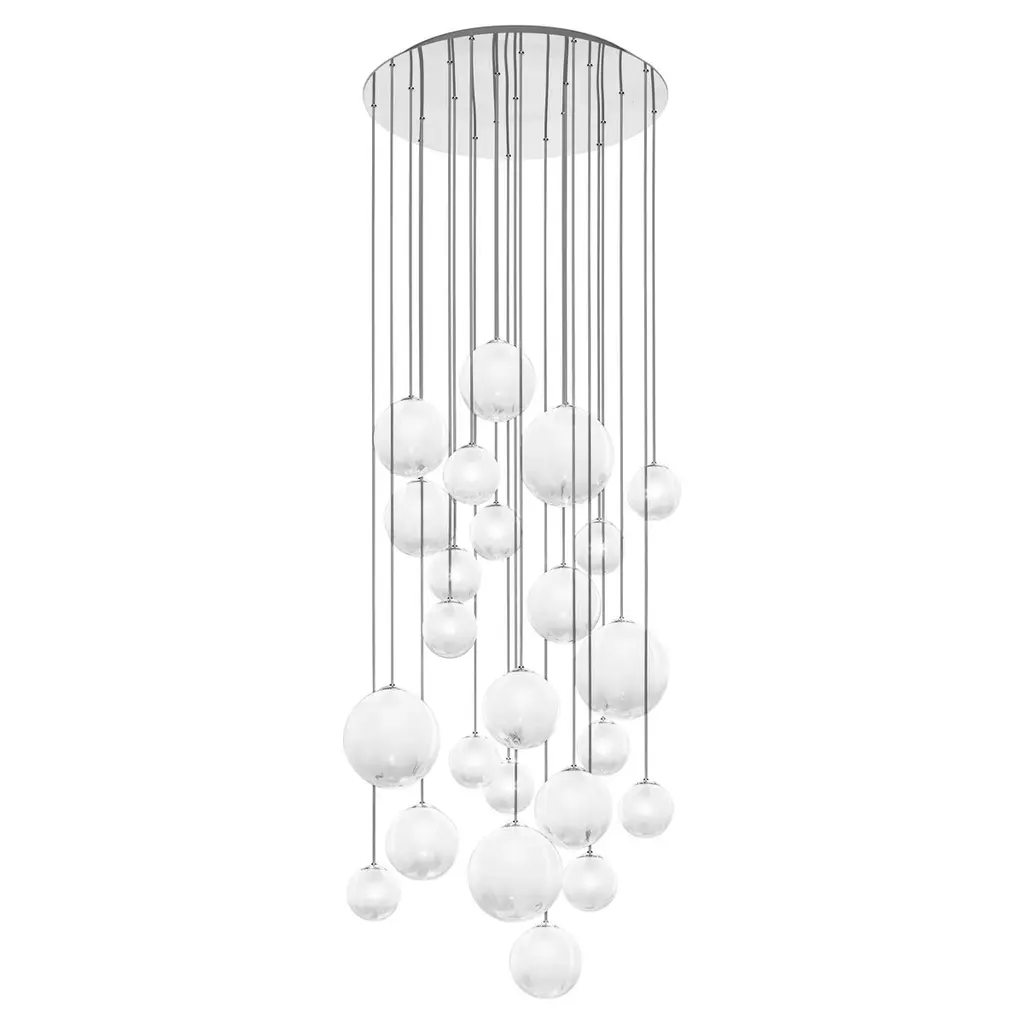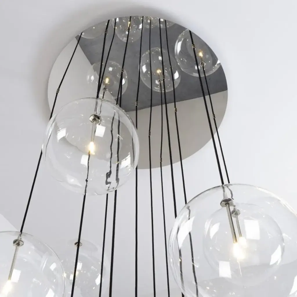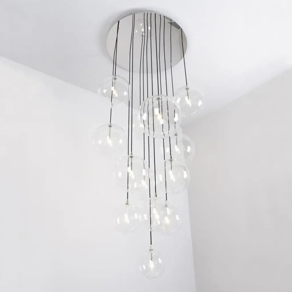 Polished nickel 13 bulb contemporary chandelier by schwung. Dimensions: d 66 x w 73 x h 200 cm. Materials: solid brass, hand-blown glass globes. Finish: polished nickel. Measures: glass globes diameter 35 / 30 / 25 / 20 / 15 cm. Max wattage 1.6w. Bulb base g4, 12v ac. Lumens 1000lm. Color temperature 2700k. Maximum bulb diameter 10mm. Dimmable with electronic (elv, trailing edge) dimmers only. Made entirely of solid brass and handblown glass globes. Could be dimmable. Schwung is a german word, and loosely defined, means energy or momentumm of a positive manner. Synonyms: verve, zest, panache, momentum. Mission: developing lighting fixtures through simple and timeless materials, sustainably; we are committed to creating quality products that last. Beginning with the design we are constantly refining aesthetic and function. Both in the lamps themselves and throughout the manufacturing process we pursue a holistic approach to efficiency, and the reduction of environmental impact. Concept: schwung is a lighting concept, connecting aesthetic and quality through matter. An exploration of history, forms and function, elegantly fulfilling an essential need of modern life, capturing light. Our pieces play with architecture or create spaces of their own. Founded by dominique sente (belgium) and rudi nijssen, (netherlands). What began as a curiosity for objects, a venture in collecting, curating and trading antiques-became a passion to create original designs. Process: from the beginning, schwung home has striven for cutting-edge and quality lighting, handcrafted in europe. Emphasizing brass and glass, which are not only durable but can be reused indefinitely, our lamps are 98% recyclable. Today the company operates out of an integrated design and manufacturing facility in poland. This local approach allows us to significantly shorten the product lead time and greatly improve quality standards. All our lamps can be wired according to each country. If sold to the usa it will be wired for the usa for instance. up to 250v (europe/uk standard).
