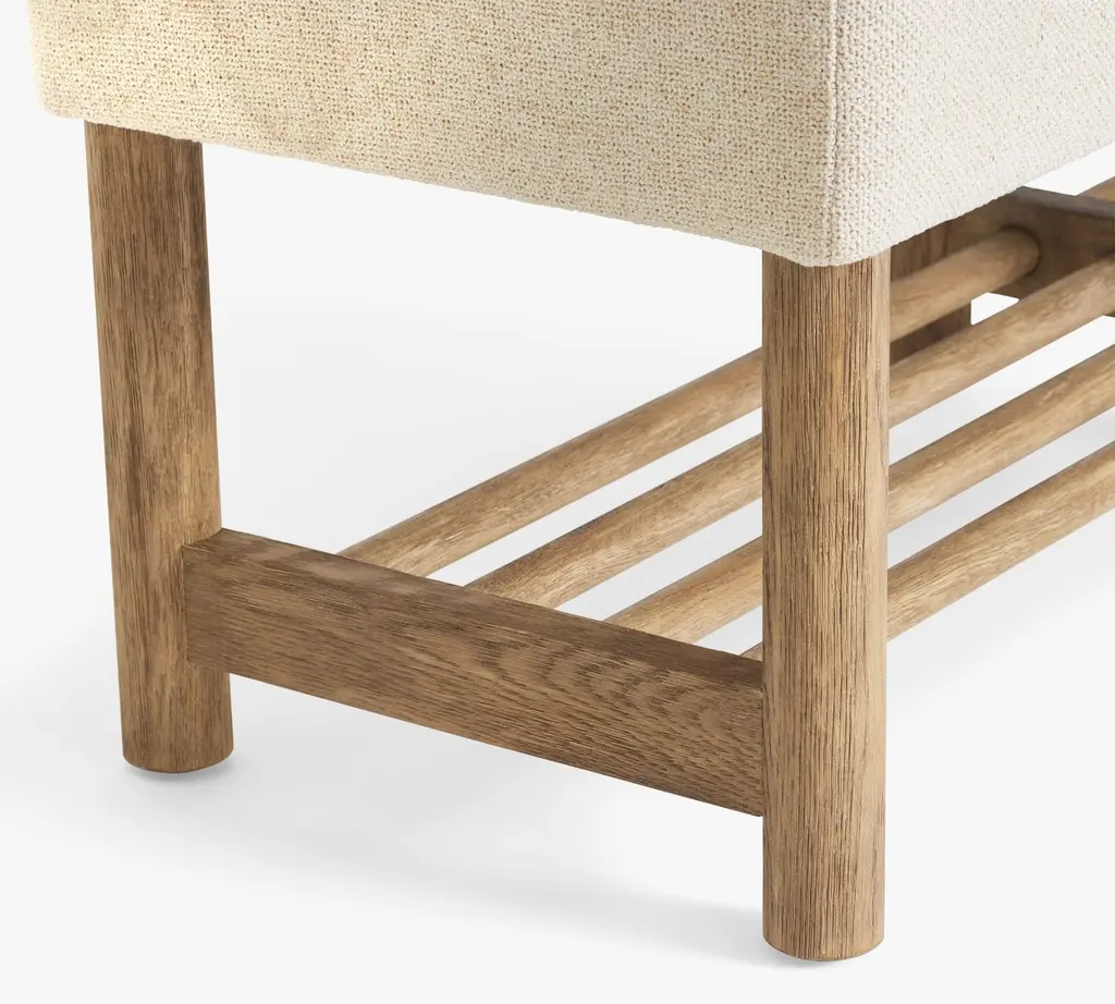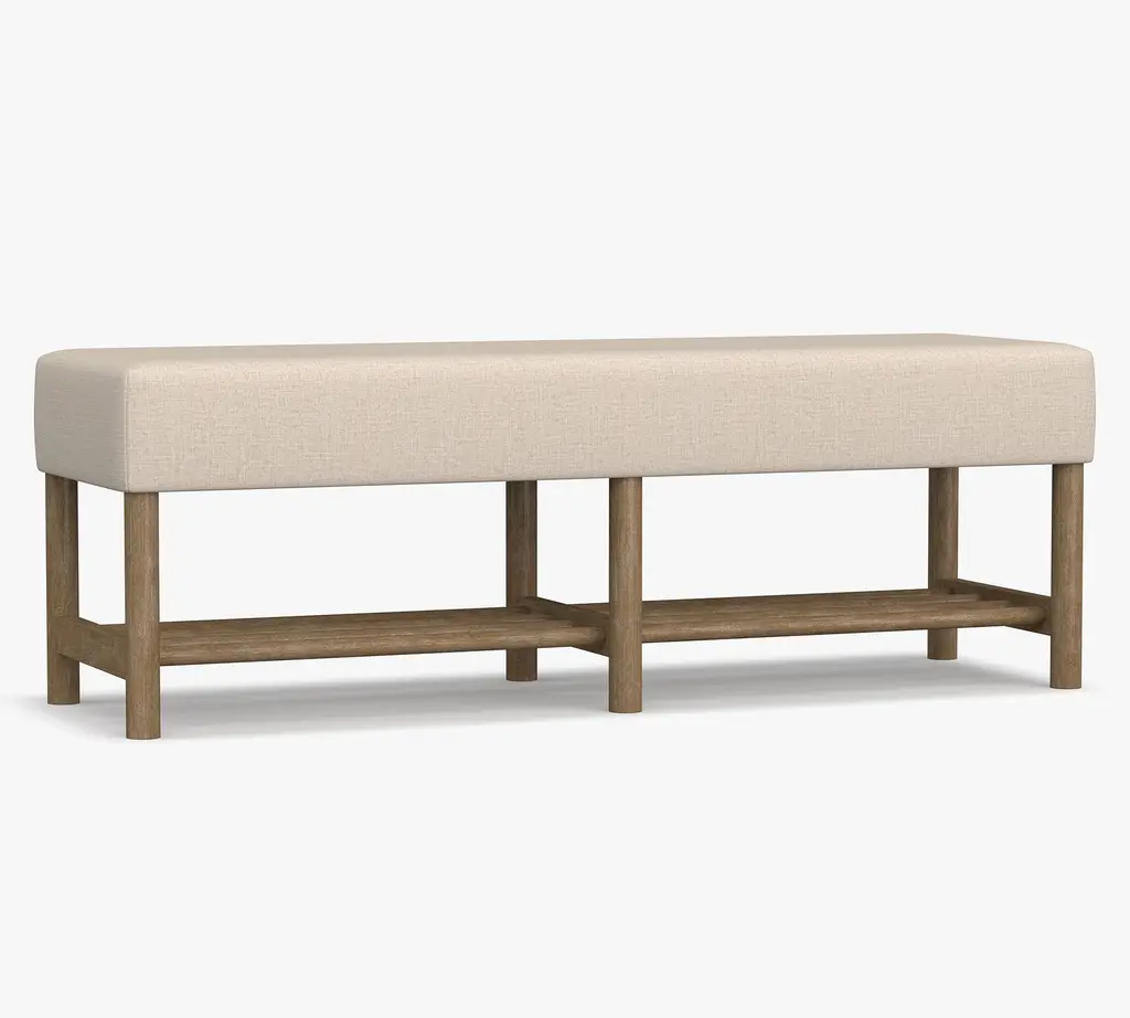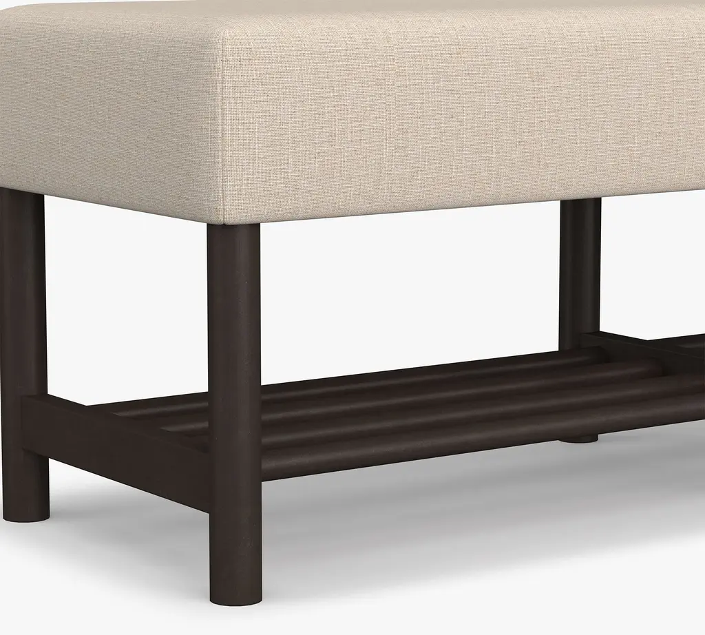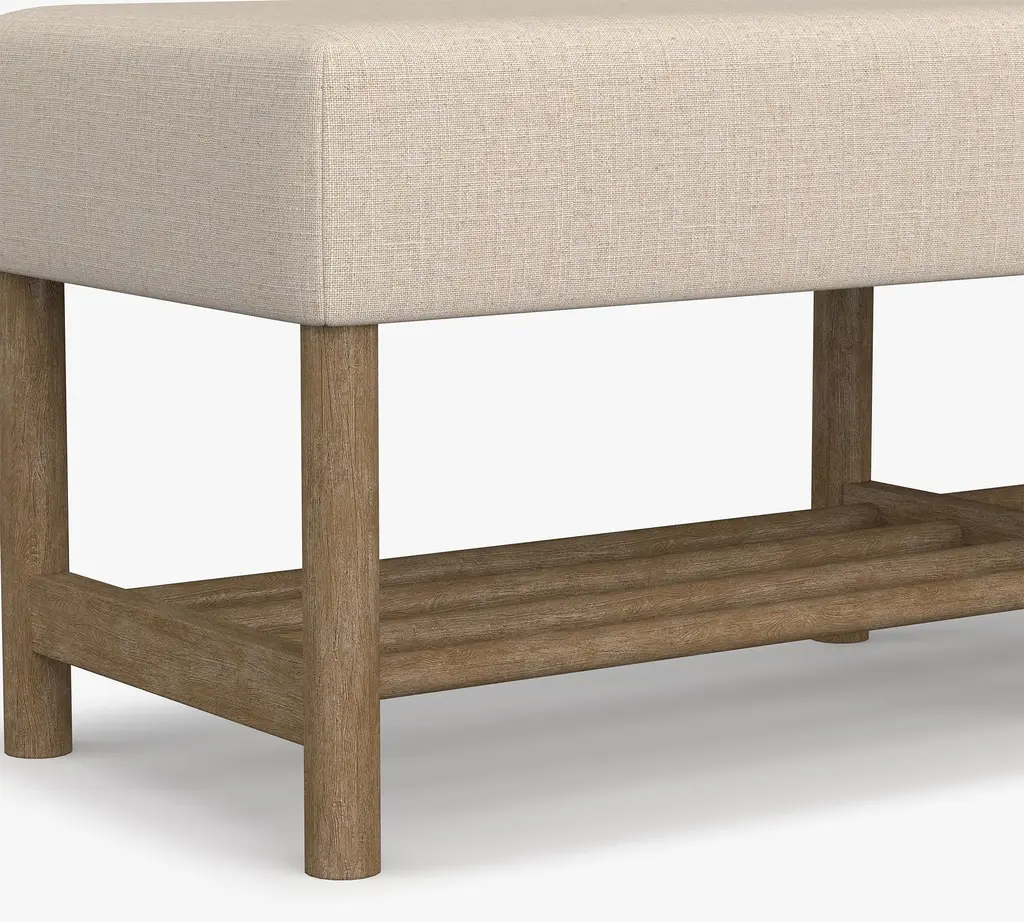 A classic silhouette meets lounge-worthy comfort in the Clyde Collection. The expertly crafted wood frame features generous padding in your choice of upholstered fabrics, adding a modern farmhouse look to the end of a bed or living room. A pallet shelf provides a stylish storage solution for anything from shoes to out-the-door accessories.