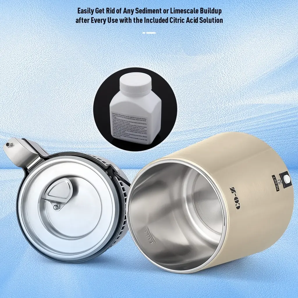 Searching for an eco-friendly alternative to bottled water and an affordable alternative to filter-heavy water purifiers?Then this distilled water machine is just for you! Enjoy cleaner and healthier water from this water distiller's 750W heating element that boils to effectively remove germs, toxins, and other contaminants. Purify your water at 0.3 gallons per hour to give you a clean water supply for your kitchen, home office, lab, dental clinic, and more. The 1.1 gallon distilled water maker is made of food grade 304 stainless steel and its heater automatically turns off when it reaches a temperature of 300 F to prevent overheating. Use this distillation kit to get 2 ppm water to use for drinking, lab work, humidifiers, ironing, keeping your dentures clean, and more! Easily wash out mineral residue and use the included citric acid solution to clear away any sediment or limescale build-up.Order CO-Z's water purifier today to enjoy cleaner water and a healthier life!FeaturesSpecificationsPackage List
