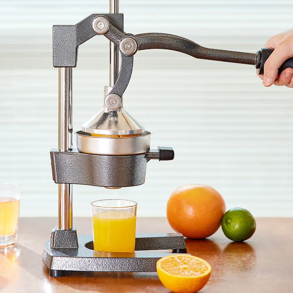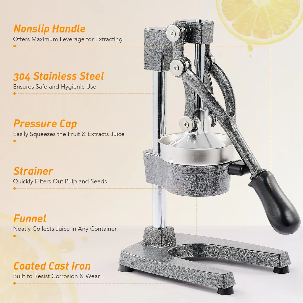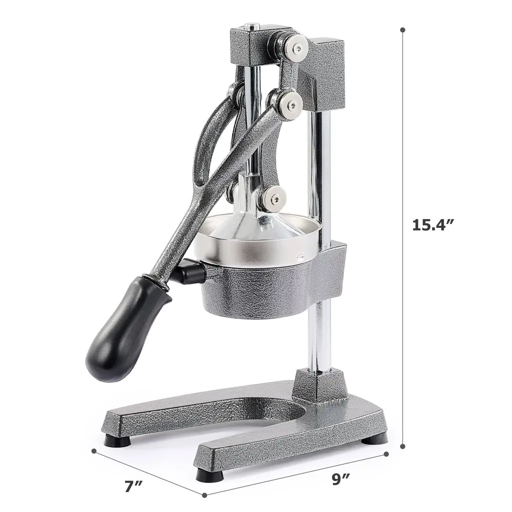 Enjoy freshly squeezed juice in the comfort of your own home! This hand press fruit juicer by CO-Z is a must-have for any juice lovers. From the food grade 304 stainless steel strainer to its rugged cast iron body, you can feel the premium quality in every detail. The ergonomically designed handle has a nonslip rubber grip, so you can comfortably crush your favorite fruit to the very last drop. Pulp and seeds are left in the strainer, while the funnel collects freshly squeezed mess free juice from blood and sumo oranges, Meyer lemons, Key limes, flame and Duncan grapefruits, Al Sirin Nar pomegranates, and more! Both the cone strainer and funnel are detachable and dishwasher safe, keeping cleaning a breeze. Leave this great looking orange juice squeezer sitting out to accent your kitchen decor or take advantage of its compact size to store it away neatly and easily as needed.Get this CO-Z hand press juicer today and start squeezing more health and joy out of every day! FeaturesSpecificationsPackage List