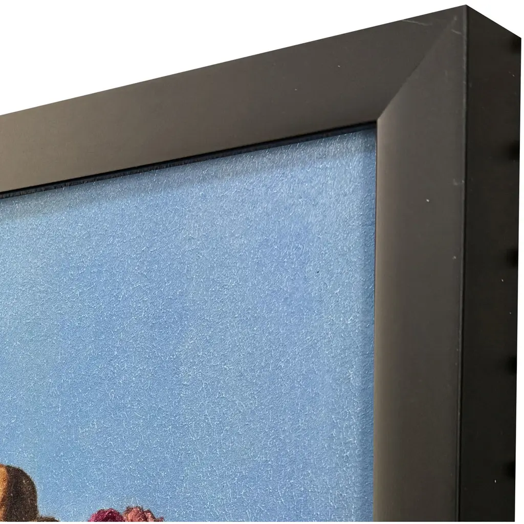 A quirky animal print provides a touch of humor. Featuring a hand applied enhanced gel finish and framed in a modern flat black molding.