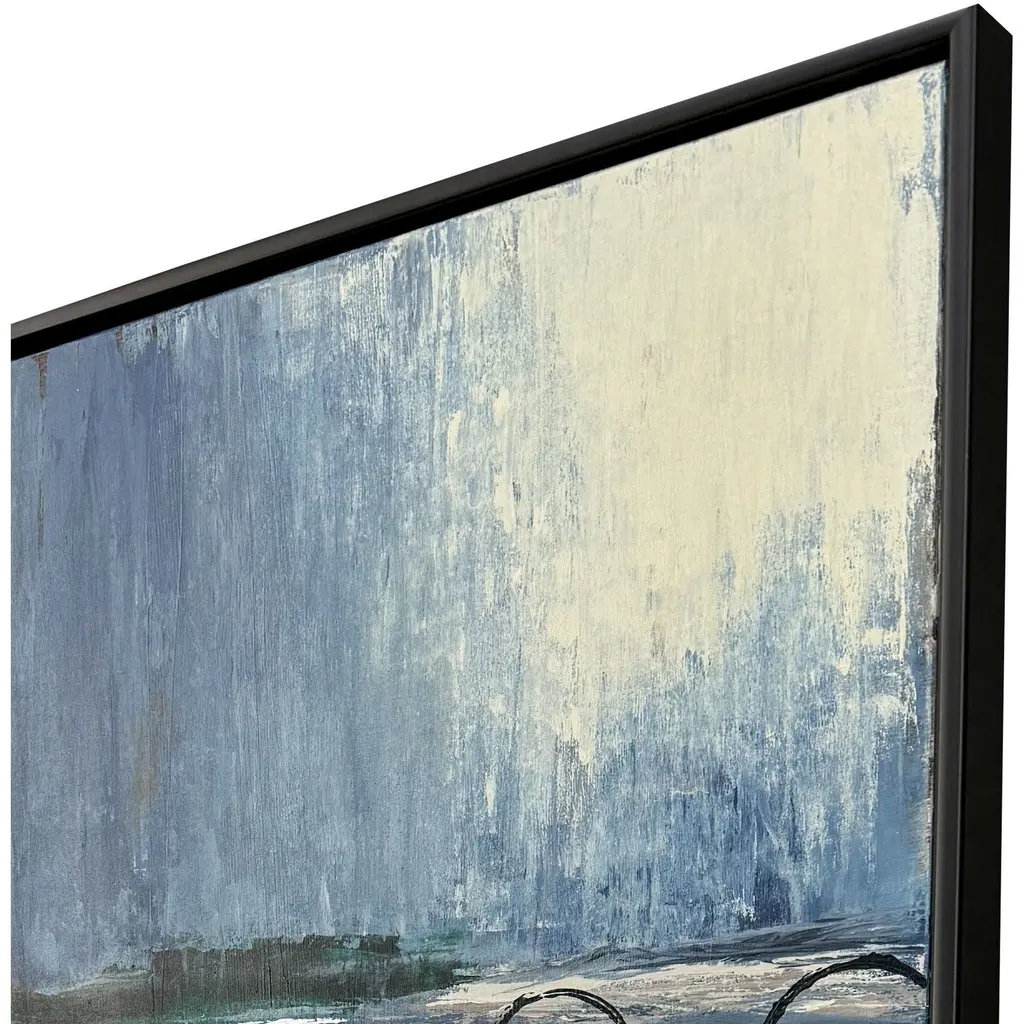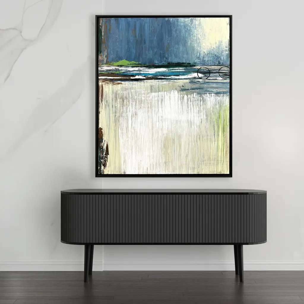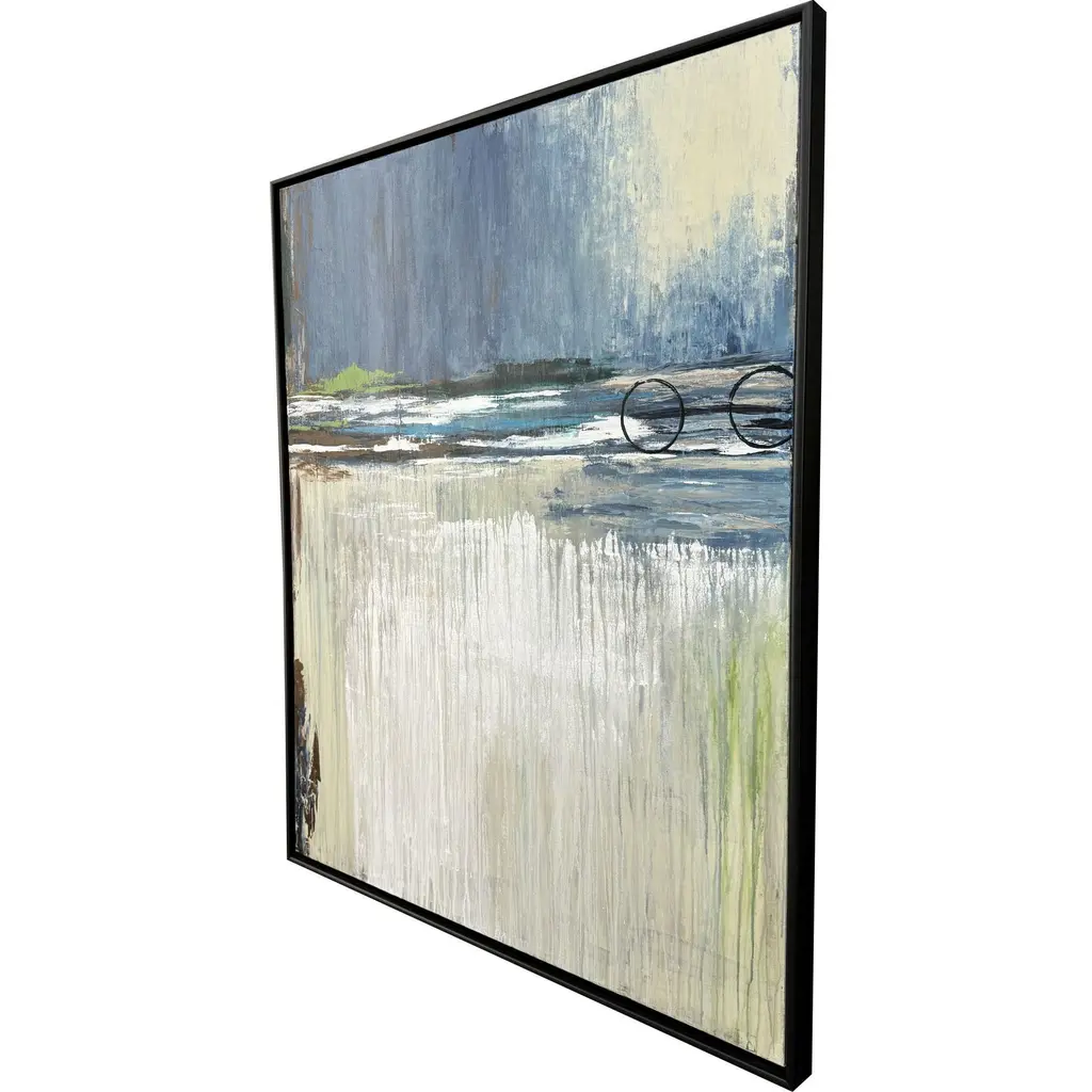 Exclusive multi-original abstract art is hand painted on canvas. The canvas is hand stretched and mounted in a satin black wood floater frame.