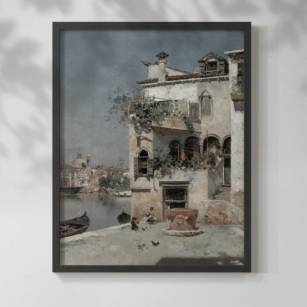 A sun-dappled street edged with arched doorways and window boxes filled with flowers beckons you toward a picturesque harbor. This gallery-wrapped wall art brightens your space with the warmth of a sunny day on the coast.