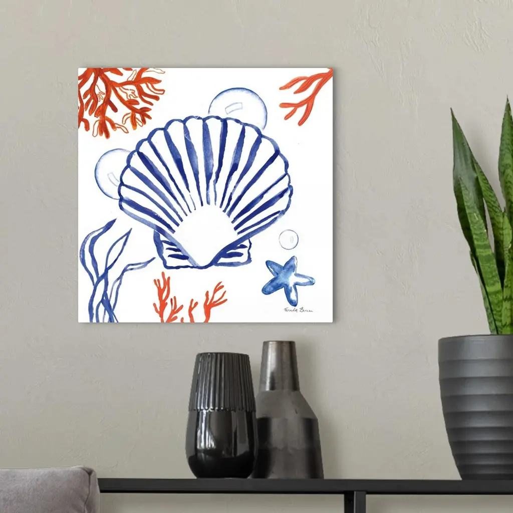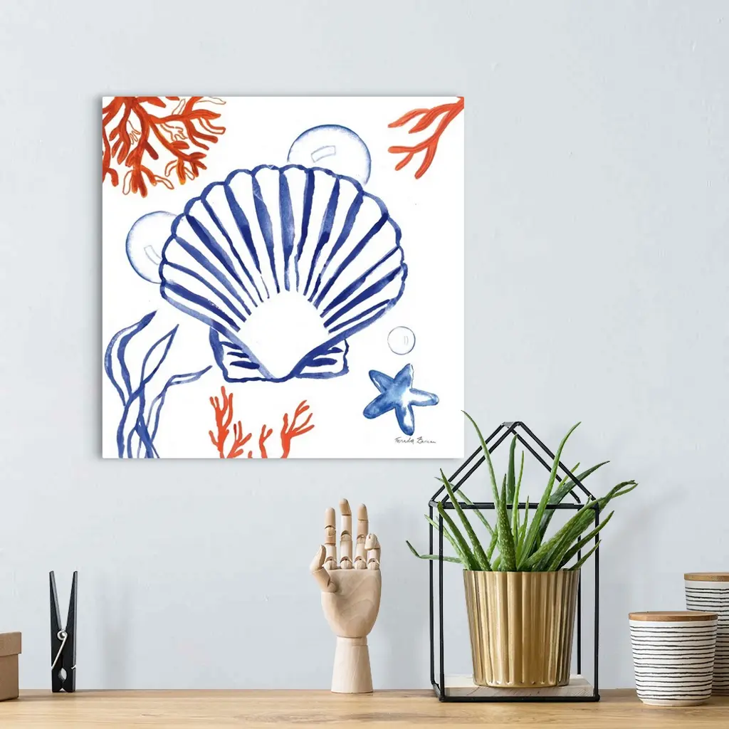 Square beach decor in coral, red, blue, and white hues with seashells, a sstarfish, bubbles, coral, and seaweed.
