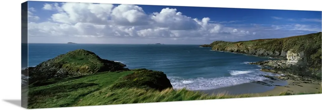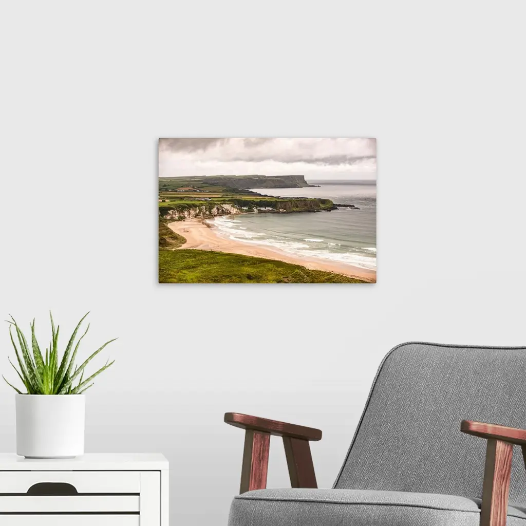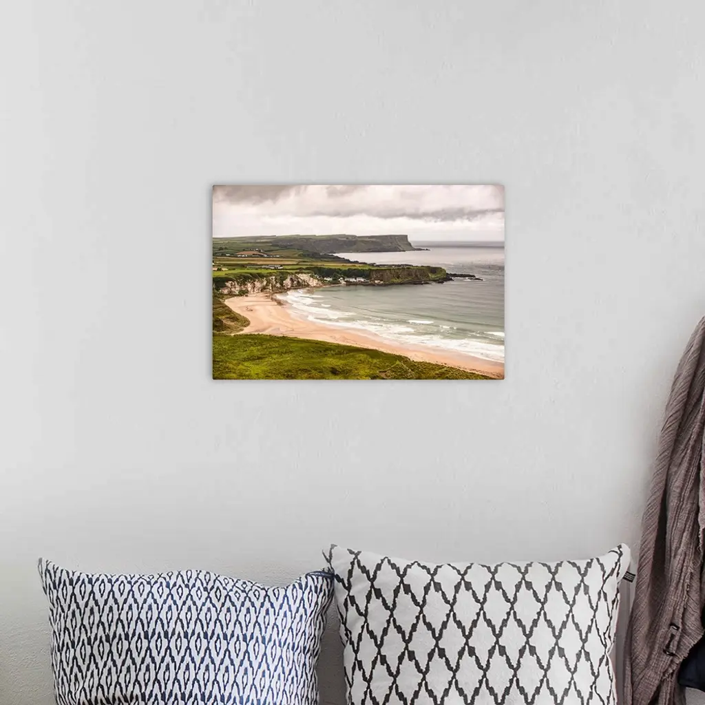 Landscape photograph of an Irish coastline with dramatic clouds above, County Antrim, Ireland.