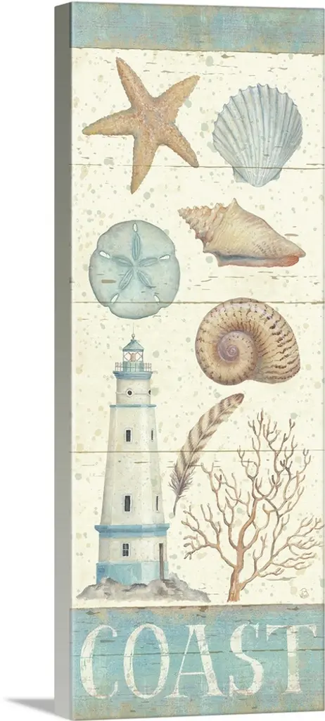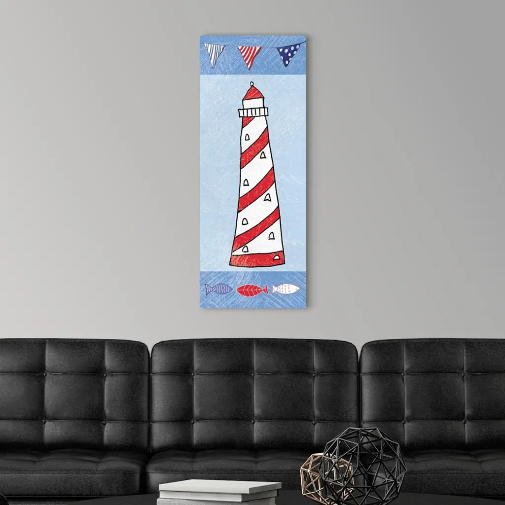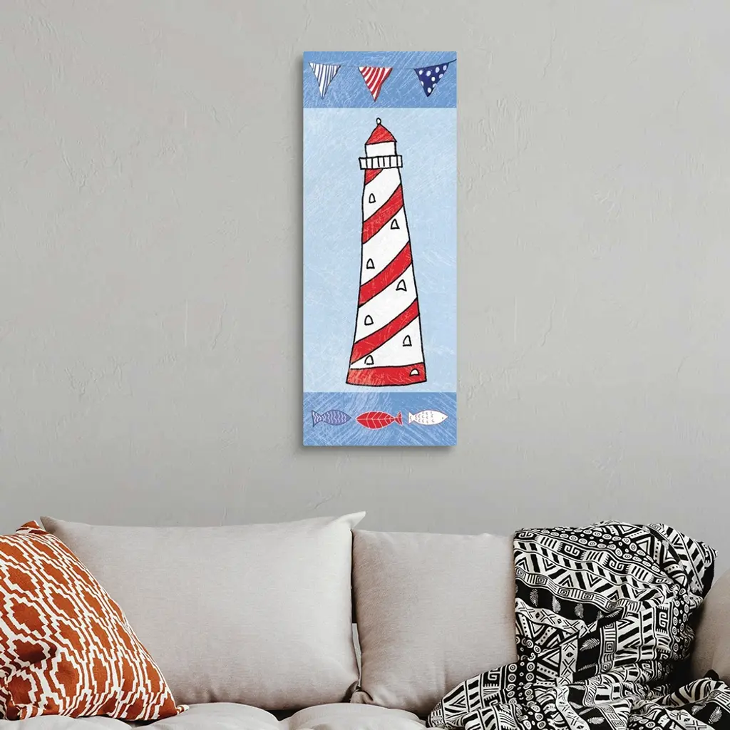 A vertical digital illustration of a white and red lighthouse with a textured effect.