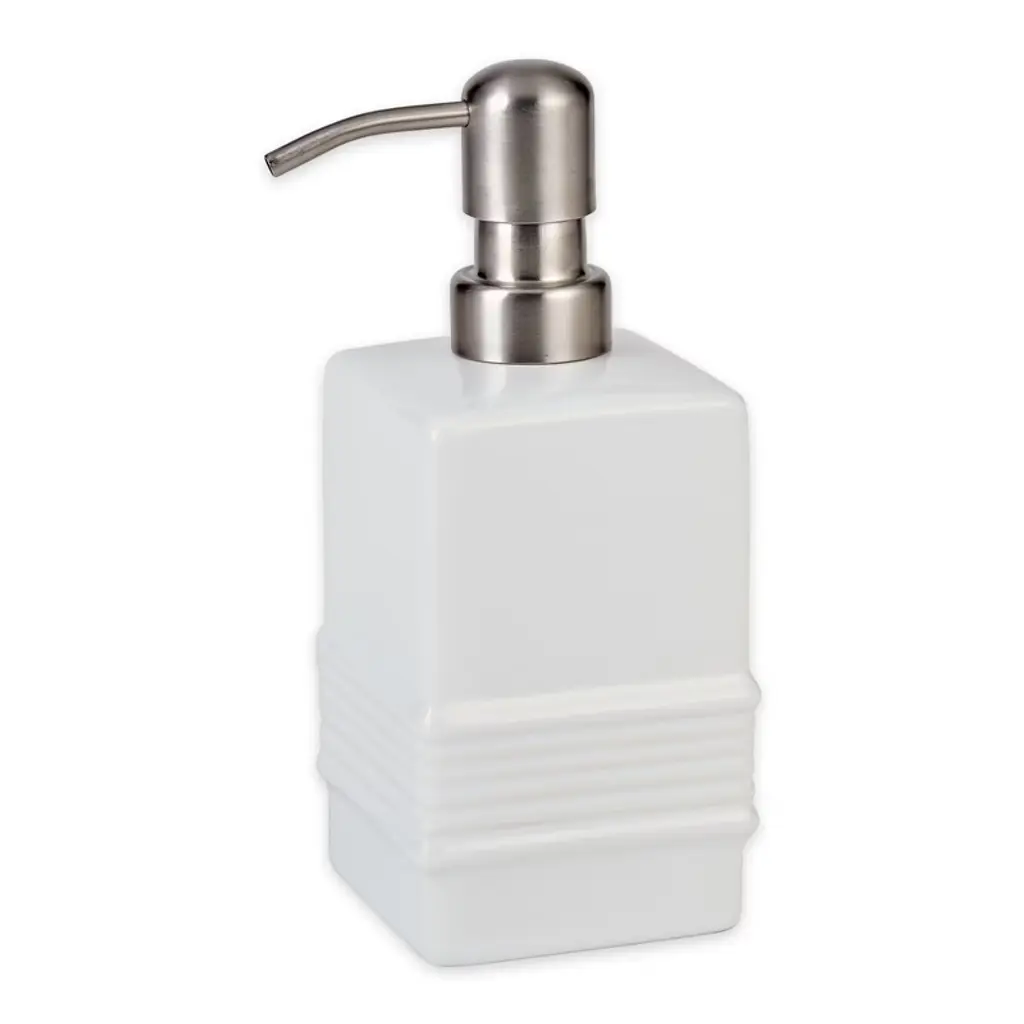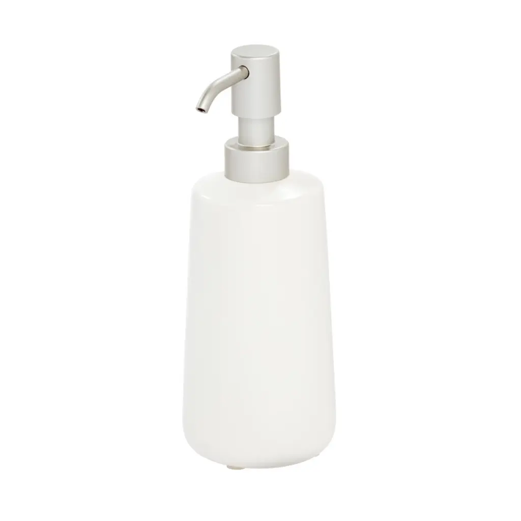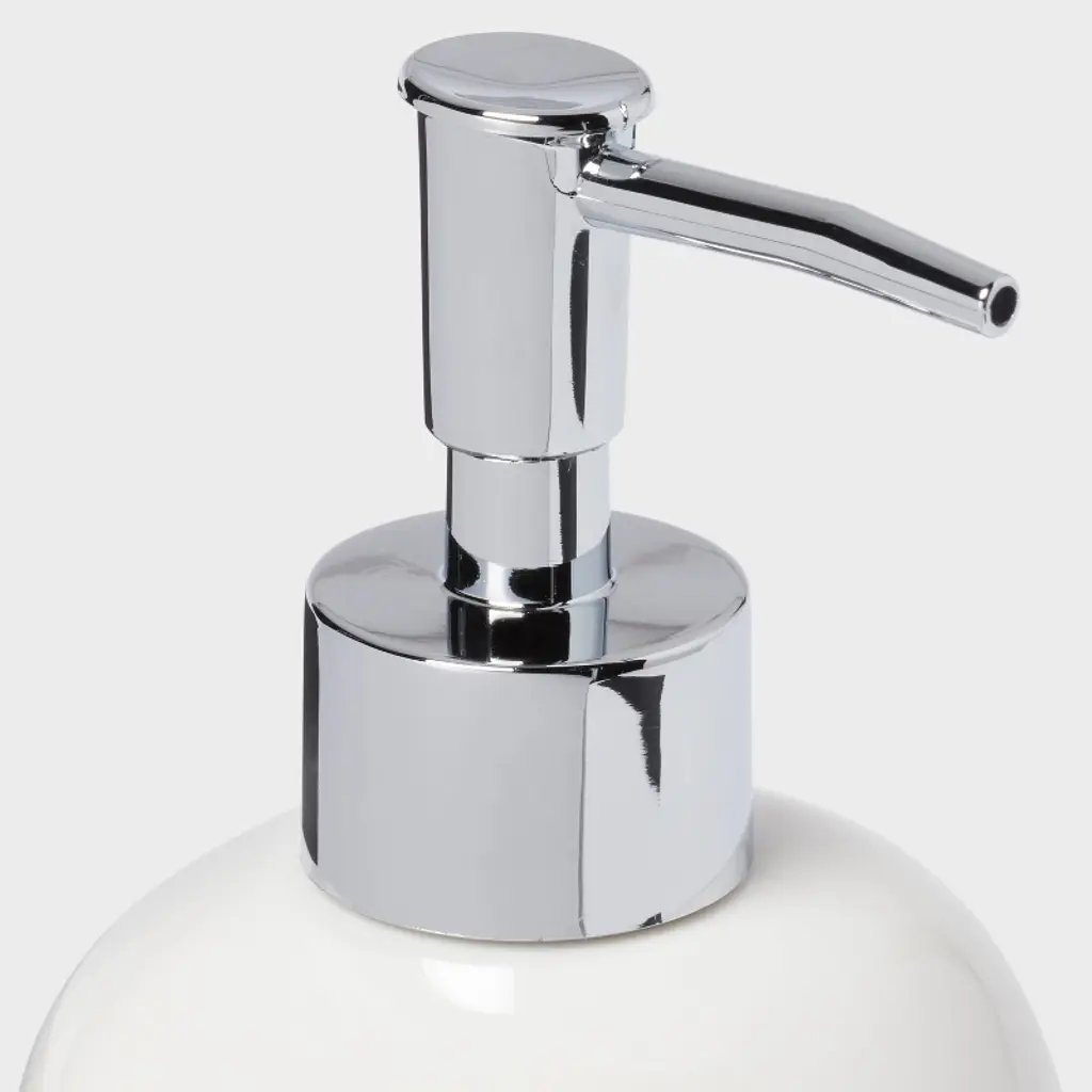 Create an elegant look in your bath space with the Coastal Soap Pump from Threshold™. This white soap pump features raised sides with a scalloped-like bottom for an appealing look. Showcasing a ceramic construction with contrasting silver lid, this soap pump is compatible with lotion. Hand wash it for easy clean up.Threshold™: Looks like home, feels like you.