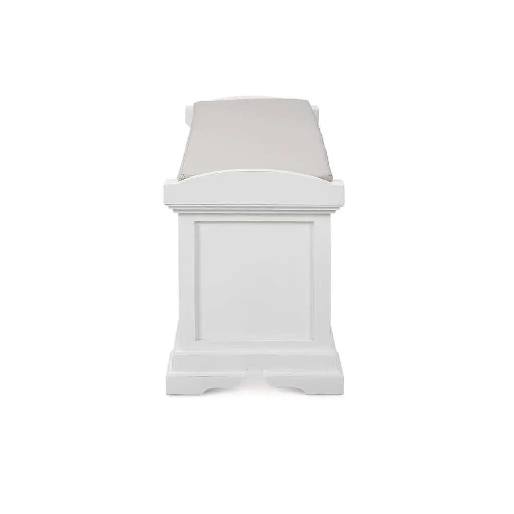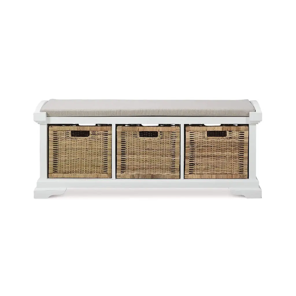 With an elegant Architectural White painted finish, it offers a clean, coastal aesthetic, beautifully contrasted by three Rattan Natural finish baskets that add a touch of rustic charm. The Camelot Performance Fabric cushion ensures a comfortable seating experience, perfect for entryways, living rooms, or bedrooms.This bench provides ample storage space with its three spacious baskets, ideal for organizing shoes, blankets, or other essentials, keeping your home both stylish and clutter-free.Dimensions: 50" W x 16" D x 20" HCustom finish options are also available. Contact us to learn more.Current lead time is 14 weeks.