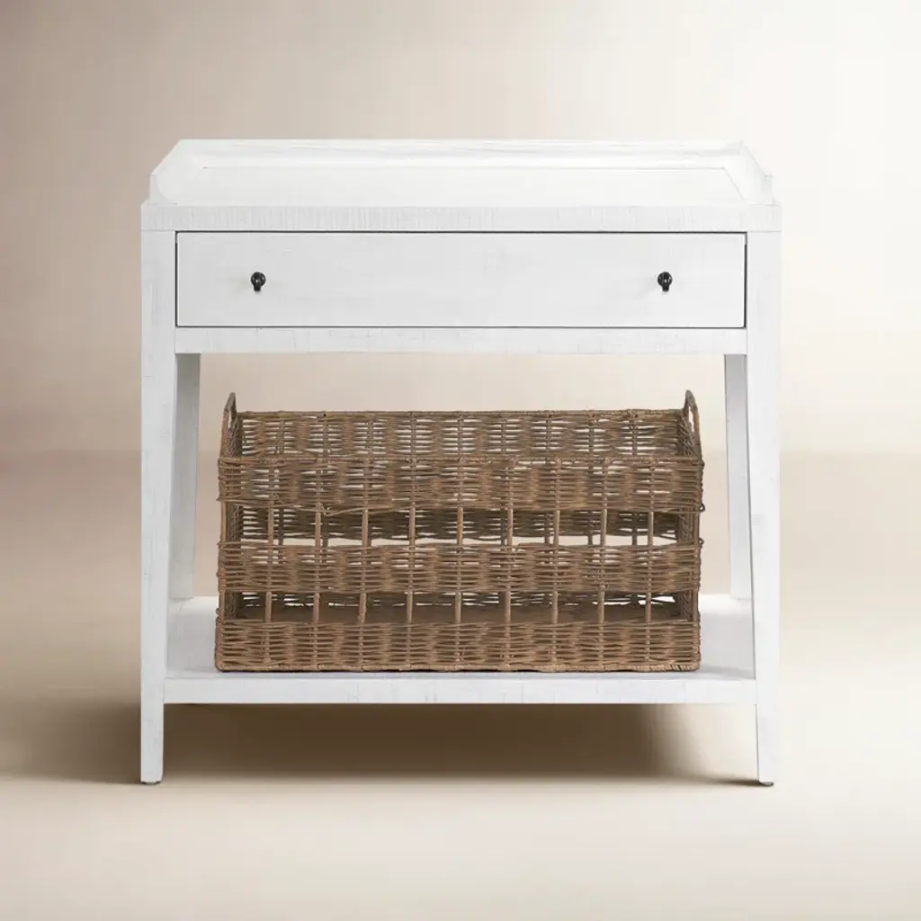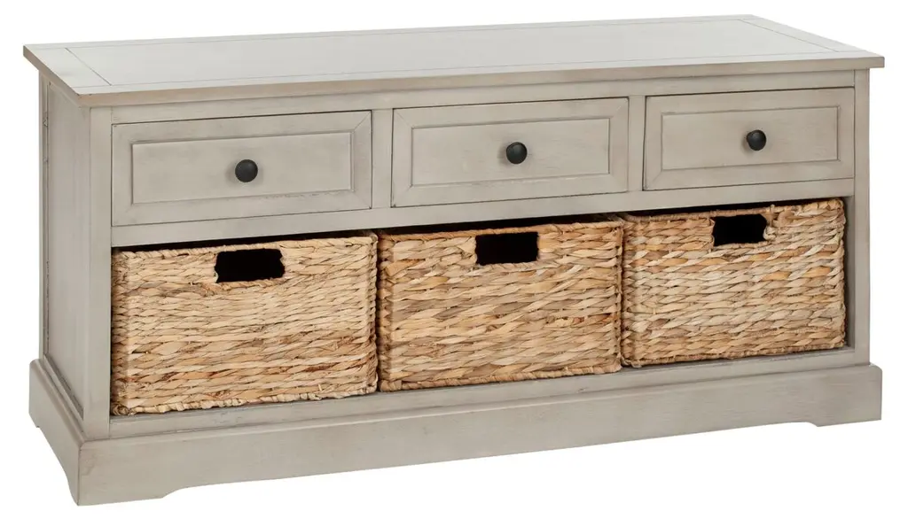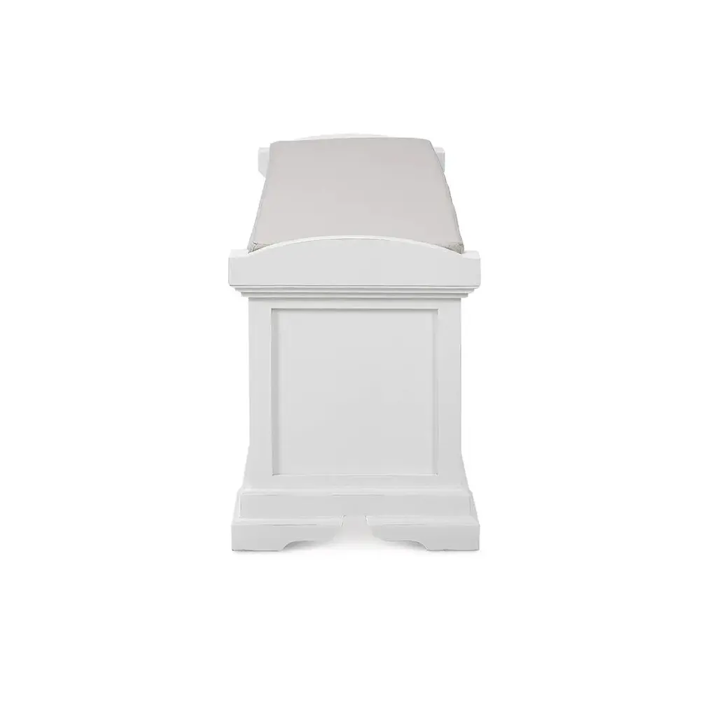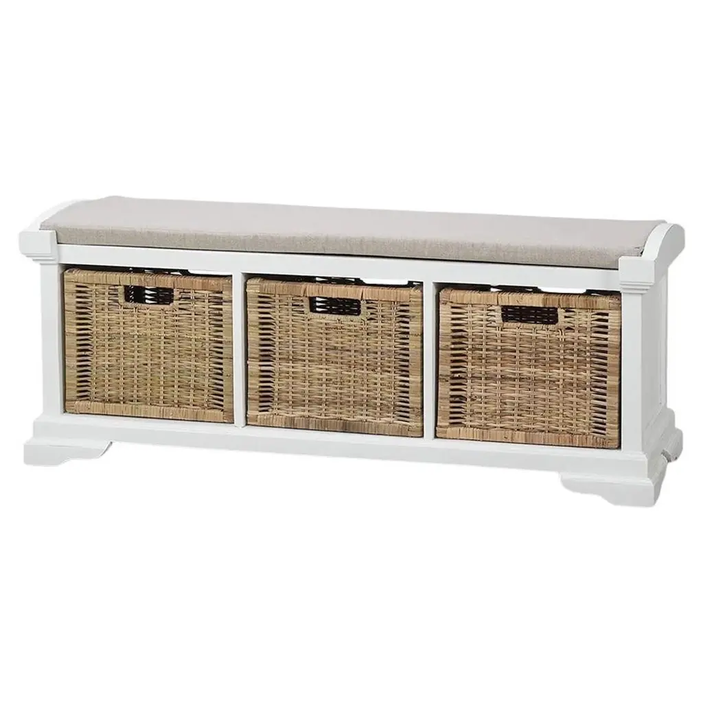 With an elegant Architectural White painted finish, it offers a clean, coastal aesthetic, beautifully contrasted by three Rattan Natural finish baskets that add a touch of rustic charm. The Camelot Performance Fabric cushion ensures a comfortable seating experience, perfect for entryways, living rooms, or bedrooms. This bench provides ample storage space with its three spacious baskets, ideal for organizing shoes, blankets, or other essentials, keeping your home both stylish and clutter-free. Dimensions: 50" W x 16" D x 20" H