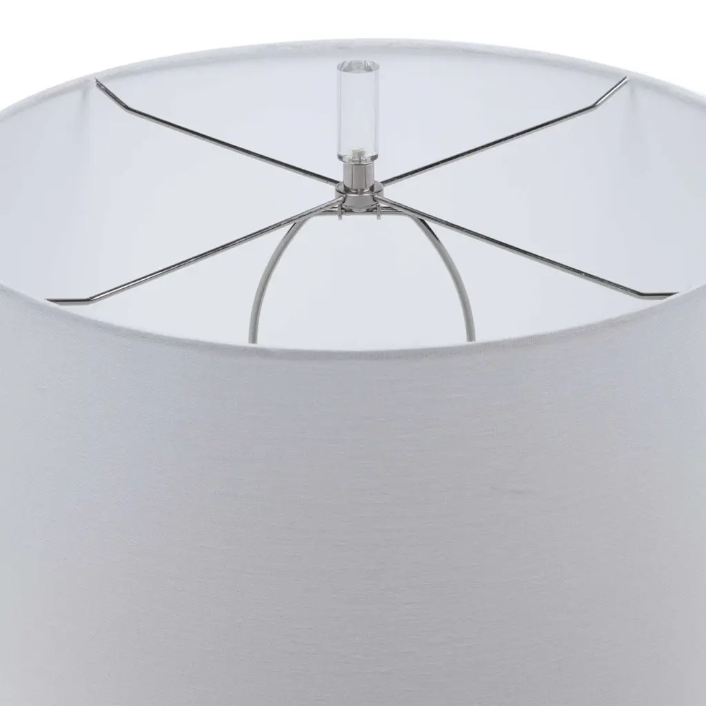 Add a hint of a coastal texture to your living space with this impressive table lamp. With a round-shaped construction, the hardback shade holds a matchless beauty over a textured base, embellished with an enticing colorway. Everything is right about this bewitching accent for lighting up your home decor. Product Features: Teal blue glossy table lamp Showcases coastal style with the ceramic base Finished in an crackle glaze with touches of rust brown Design with polished nickel and crystal accents Lamp with a round hardback drum shade is a white linen fabric Drum hardback shade with rolled edge Recommended for indoor use only Additional Features: Wattage: 150W Bulb type: E26 Socket type: 3-way Switch type: socket switch Dimensions: Lamp height; 30.5" high Shade dimensions: 10" high x 17" diameter Base dimensions: 6.5" diameter Material(s): steel/ceramic/crystal