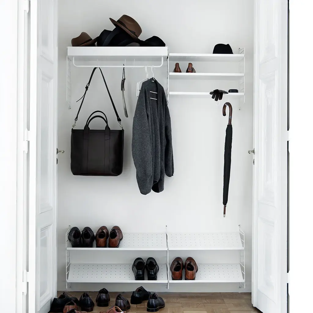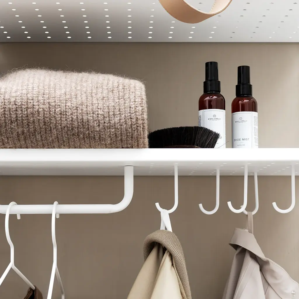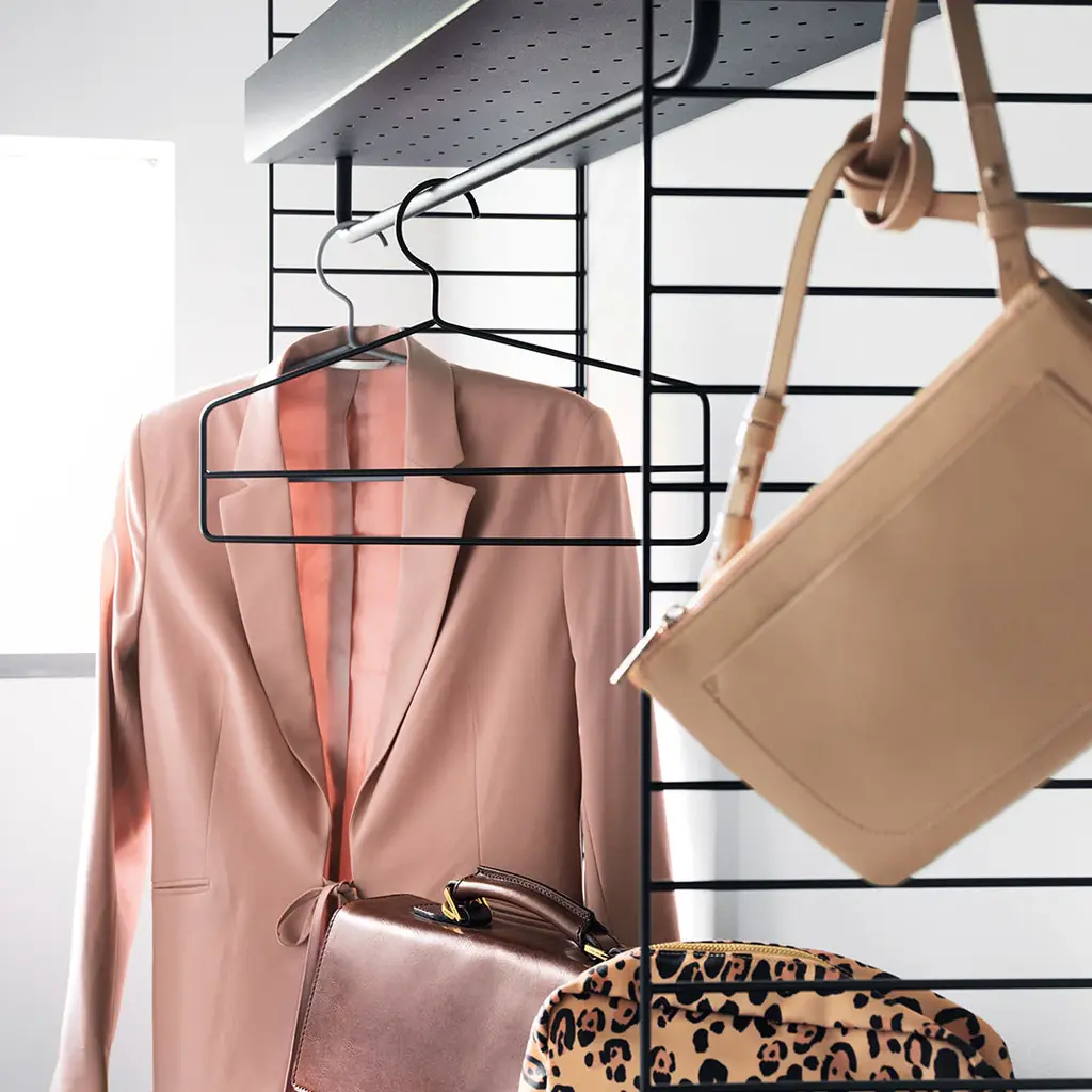 Each packaging contains four coat-hangers. The coat-hanger is part of our range of accessories and was created to be able to offer a complete storage solution for your hallway and wardrobe, where rods often are added. The coat-hanger is designed with one extra wire thread to increase functionality and make it possible to hang several clothing items on one coat-hanger.