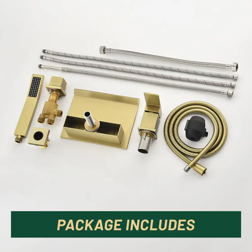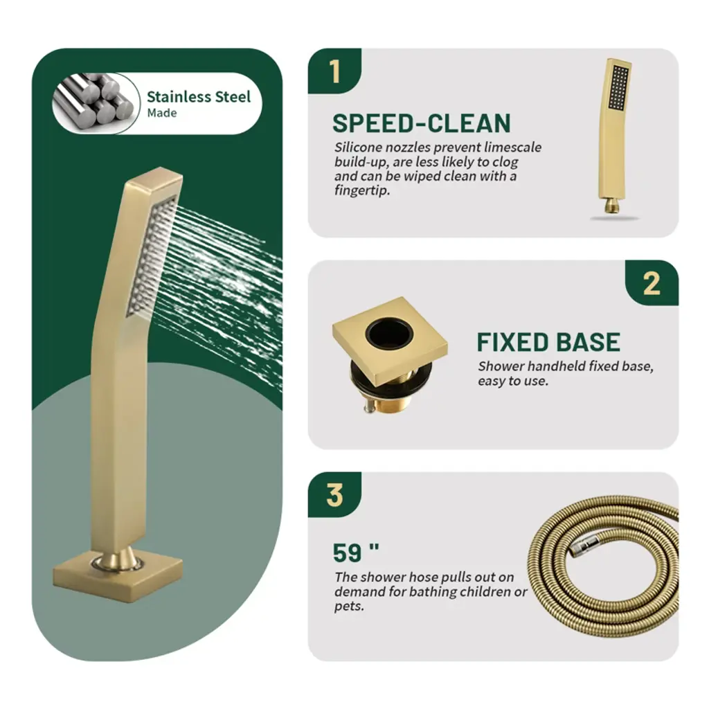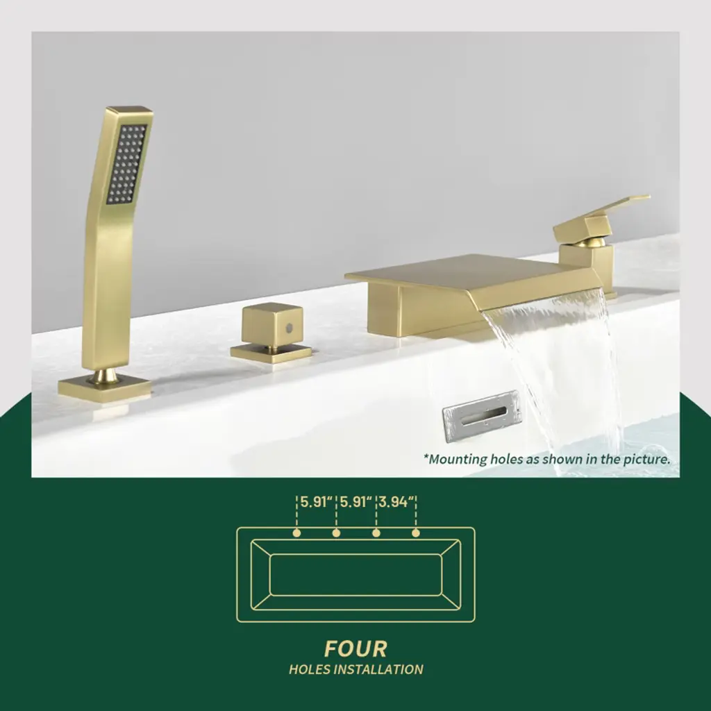 This bathtub faucet is made of high-quality brass and stainless steel, and the overall design is elegant and stylish.Its material characteristics make the product has a good anti-corrosion ability and durability, can extend the service life of the product.Simple and generous modeling design, so that it can be coordinated with a variety of styles of bathroom fixtures and decorations, to adapt to most of the bathtub bathroom environment, to ensure practical functionality at the same time, but also take into account the visual aesthetics. The bathtub shower faucet set comes with a handheld shower, bathtub faucet and 5 hoses.The bathtub faucet is designed with a 7.87-inch wide waterfall spout with a neat waterfall-like action, providing you with a steady water flow experience.The hand shower comes with a 59-inch hose with gravity ball, and the longer hose length effectively extends the shower's range of motion.At the same time, when the shower is finished, the gravity ball guides the hose back into place with its own gravity, keeping your bathroom clean and tidy, and providing you with a convenient and efficient experience. This shower faucet set adopts simple single-lever control, which is intuitive and convenient to operate, and can easily realize the water flow adjustment.In addition, it is also equipped with a diverter knob, which can be switched between the bathtub faucet and the handheld shower with just a gentle turn.Whether you are immersed in the gentle embrace of the bathtub or enjoying the pleasure of the hand shower, it is easy to realize, creating a highly efficient and comfortable bathing environment for you, so that your body and mind can get the ultimate relaxation under the caress of the water. This product adopts 4-hole installation method, reasonable layout is convenient for daily shower use. We have a professional after-sales team, ready to provide you with support to ensure peace of mind and worry-free use.